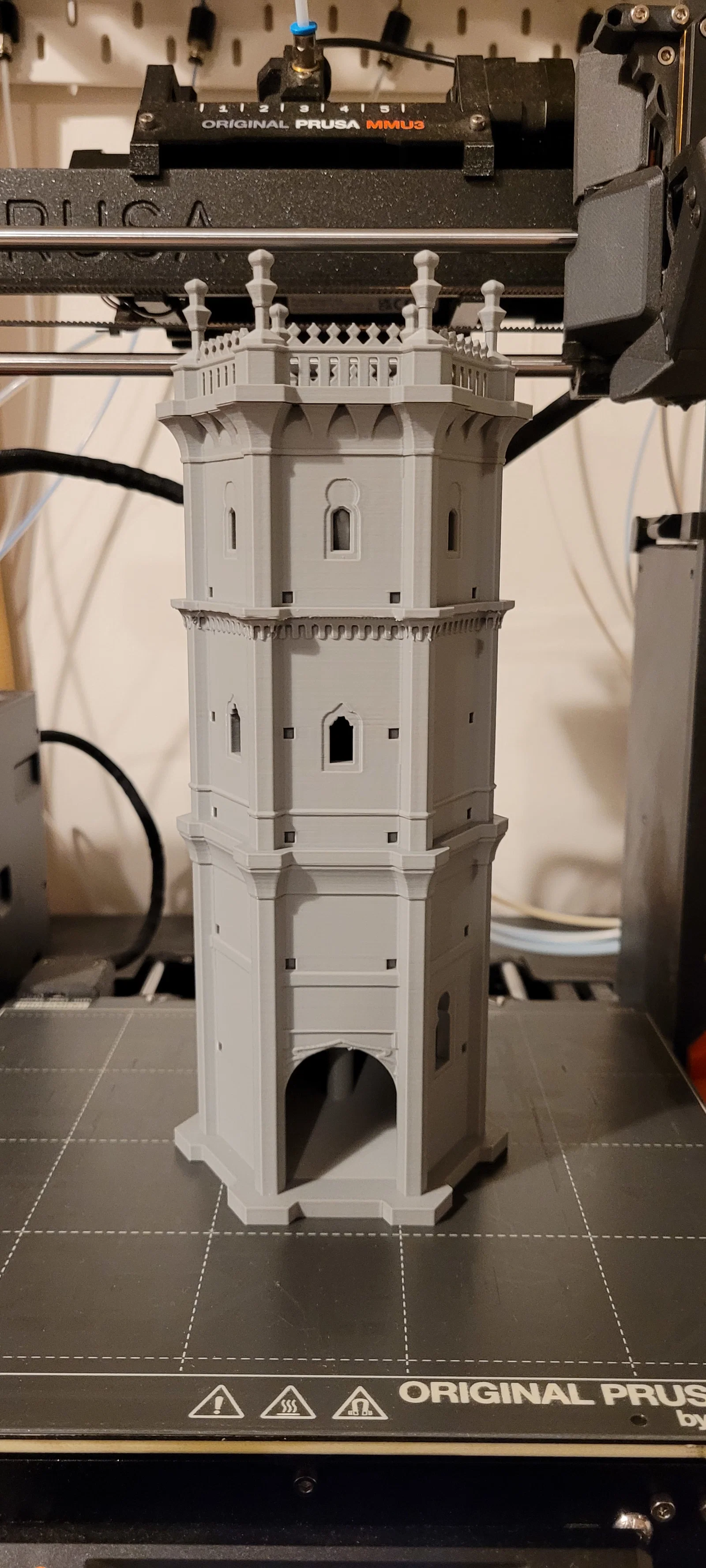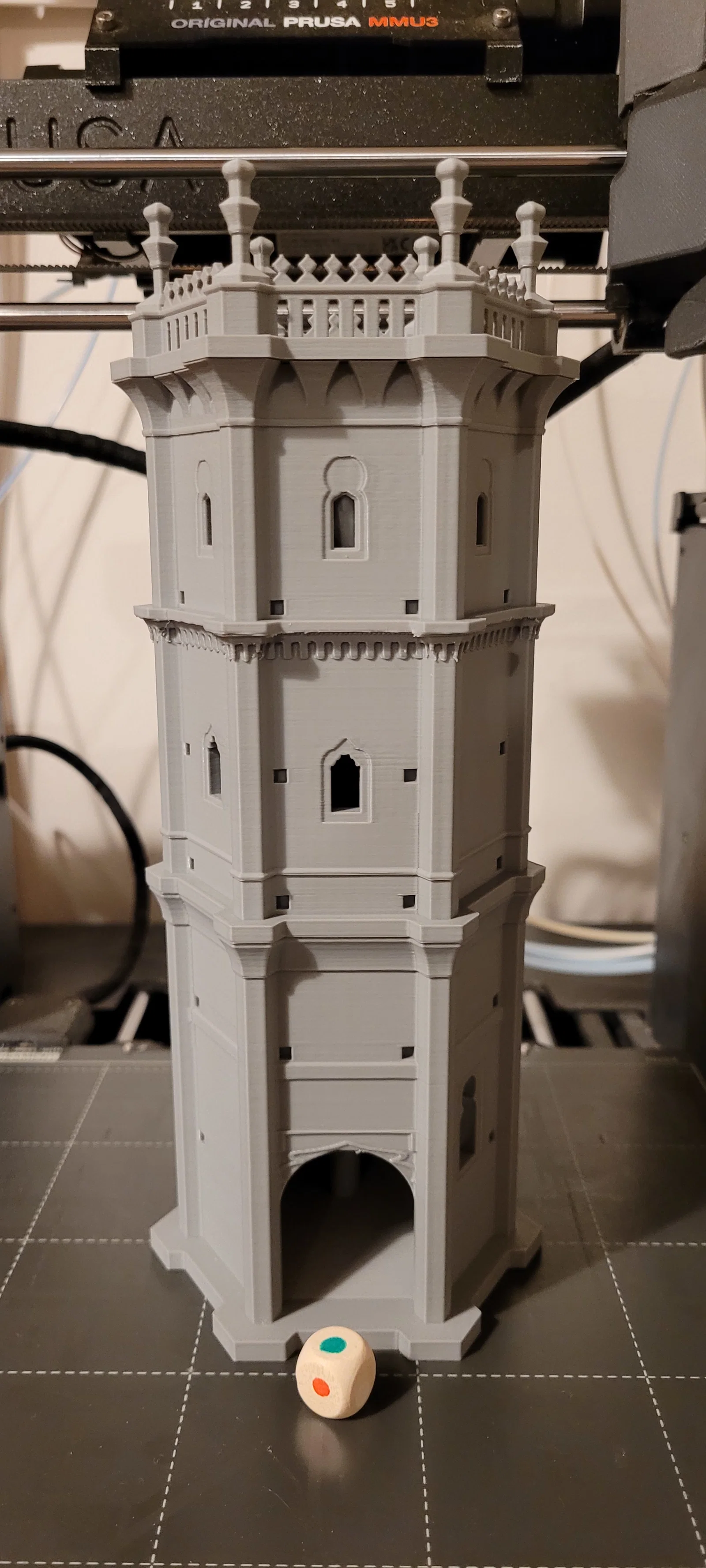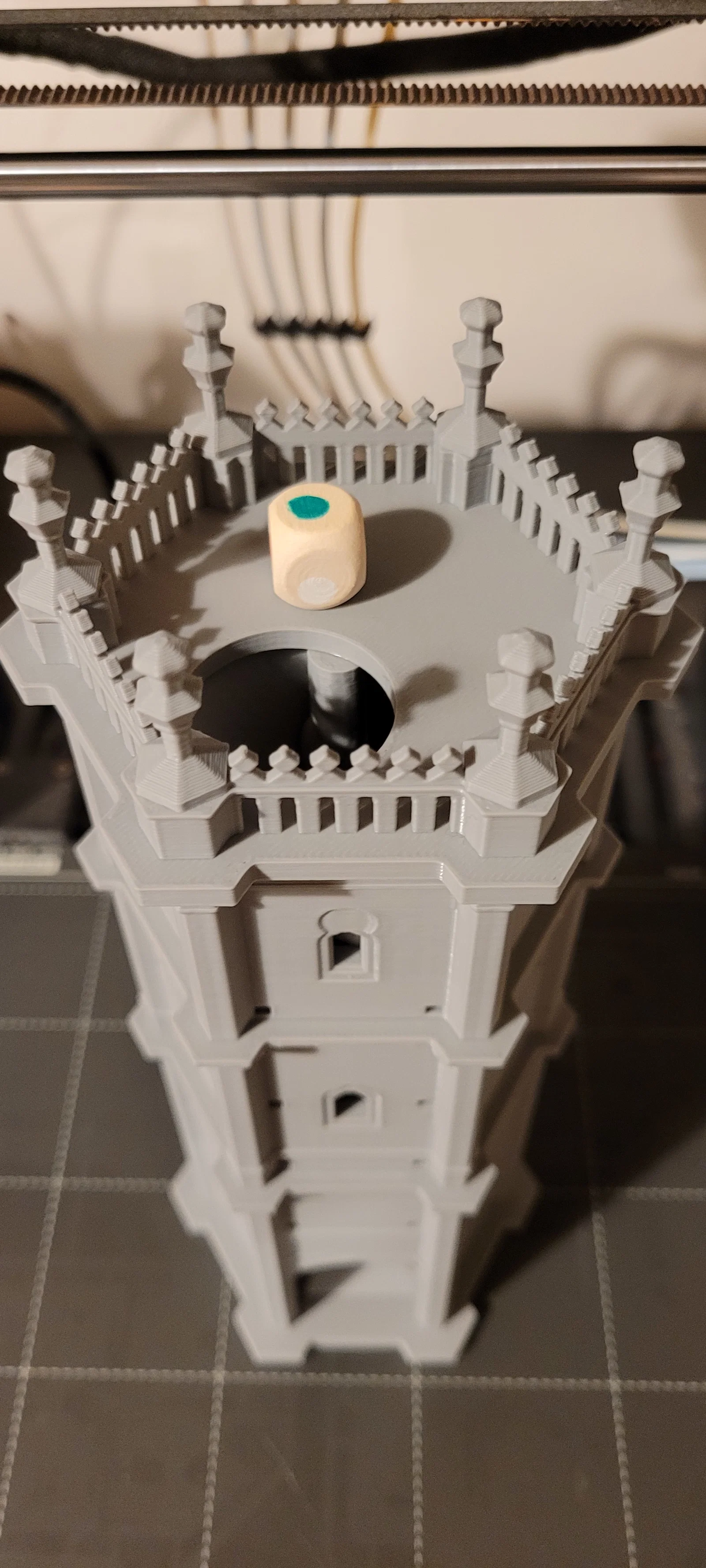 Tháp đổ xúc xắc (dice tower) được thiết kế dựa trên hình mẫu của đài quan sát Slavín. Mô hình này được chia làm hai phần riêng biệt là phần tháp và phần mái. Bạn có thể in 3D dễ dàng mà không cần dùng đến vật liệu hỗ trợ (supports).