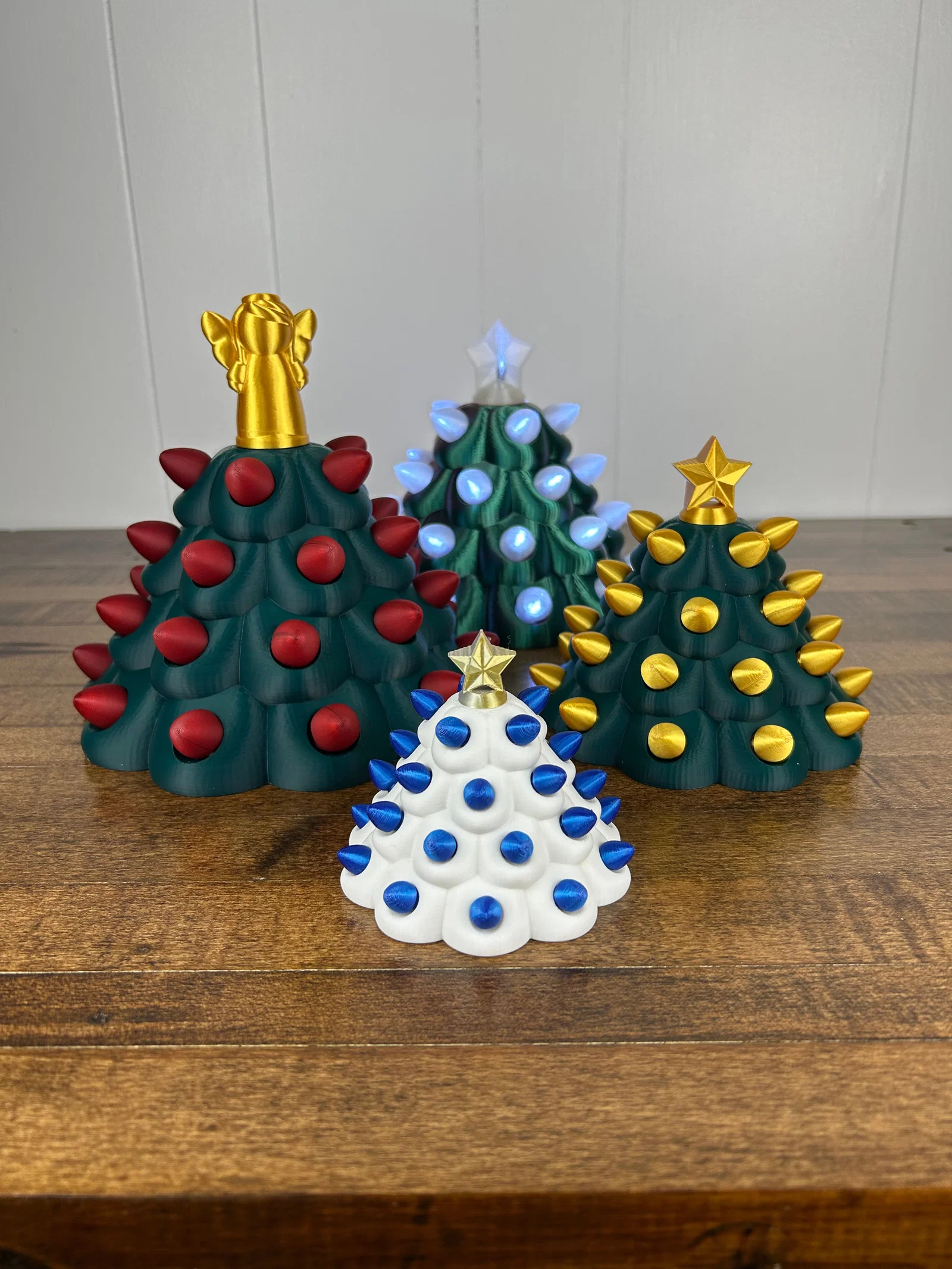 - Phiên bản gắn đèn (Light Up Version): Phiên bản này có các bóng đèn rỗng bên trong để bạn luồn dây LED (hãy thử kích thước dây trước khi in nhé). Phần “Inside Cone” cũng có lỗ ở đỉnh để đèn sáng lên trên đỉnh cây. Không nên in nhỏ phiên bản này vì khó nhét đèn LED vào. Việc luồn dây điện vào trong bóng đèn khi đã có quà bên trong hơi khó một chút, nhưng đây sẽ là món đồ trang trí tuyệt vời sau khi mở quà.
