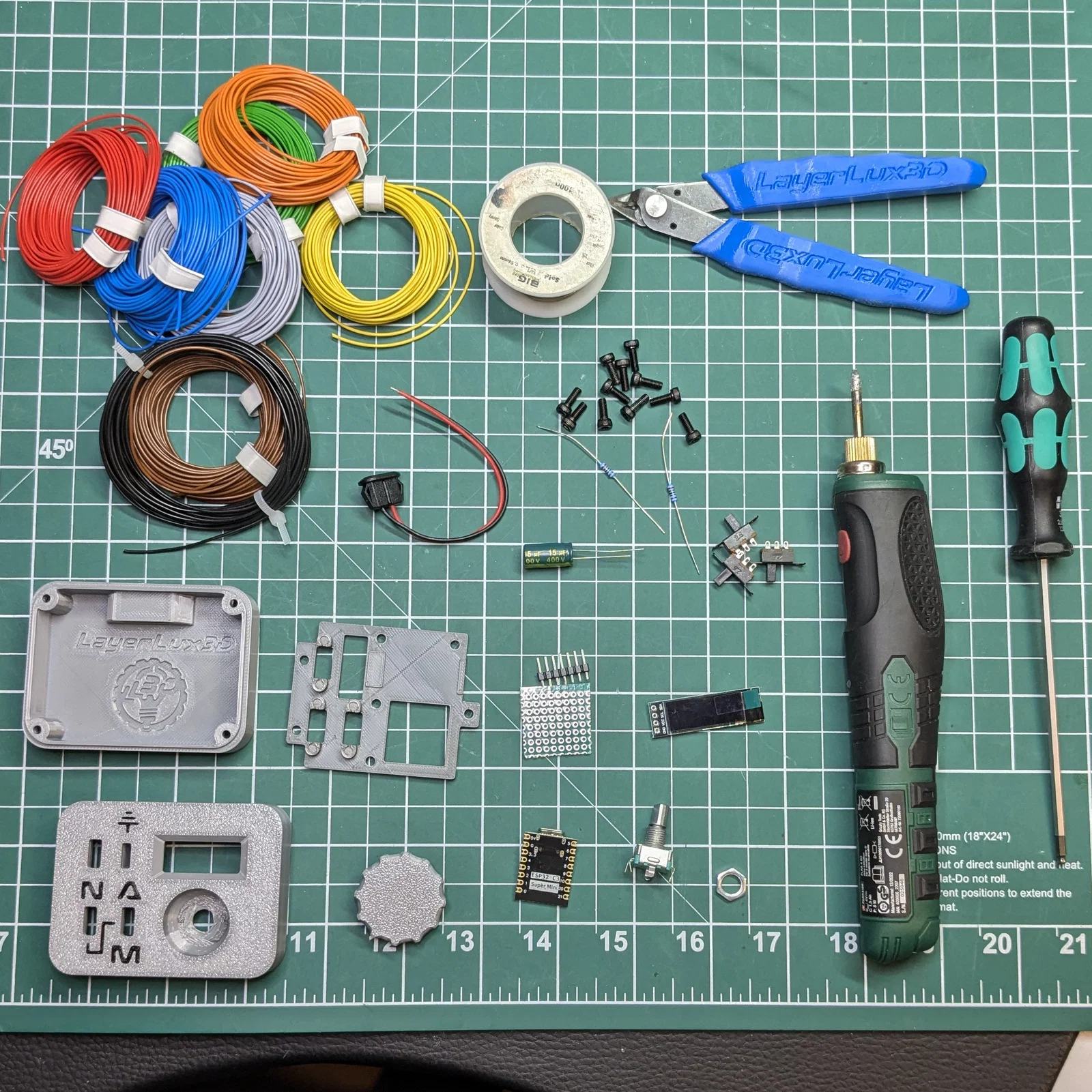 Linh kiện cần thiết: 1x ESP32-C3 2x điện trở 1kΩ 3x nút nhấn nhỏ 11x ốc vít M3 8mm 1x rotary encoder (EC11, trục 15mm) 1x tụ điện 1µF 1x màn hình OLED I2C SSD1306 0.91-inch Dây điện và mỏ hàn