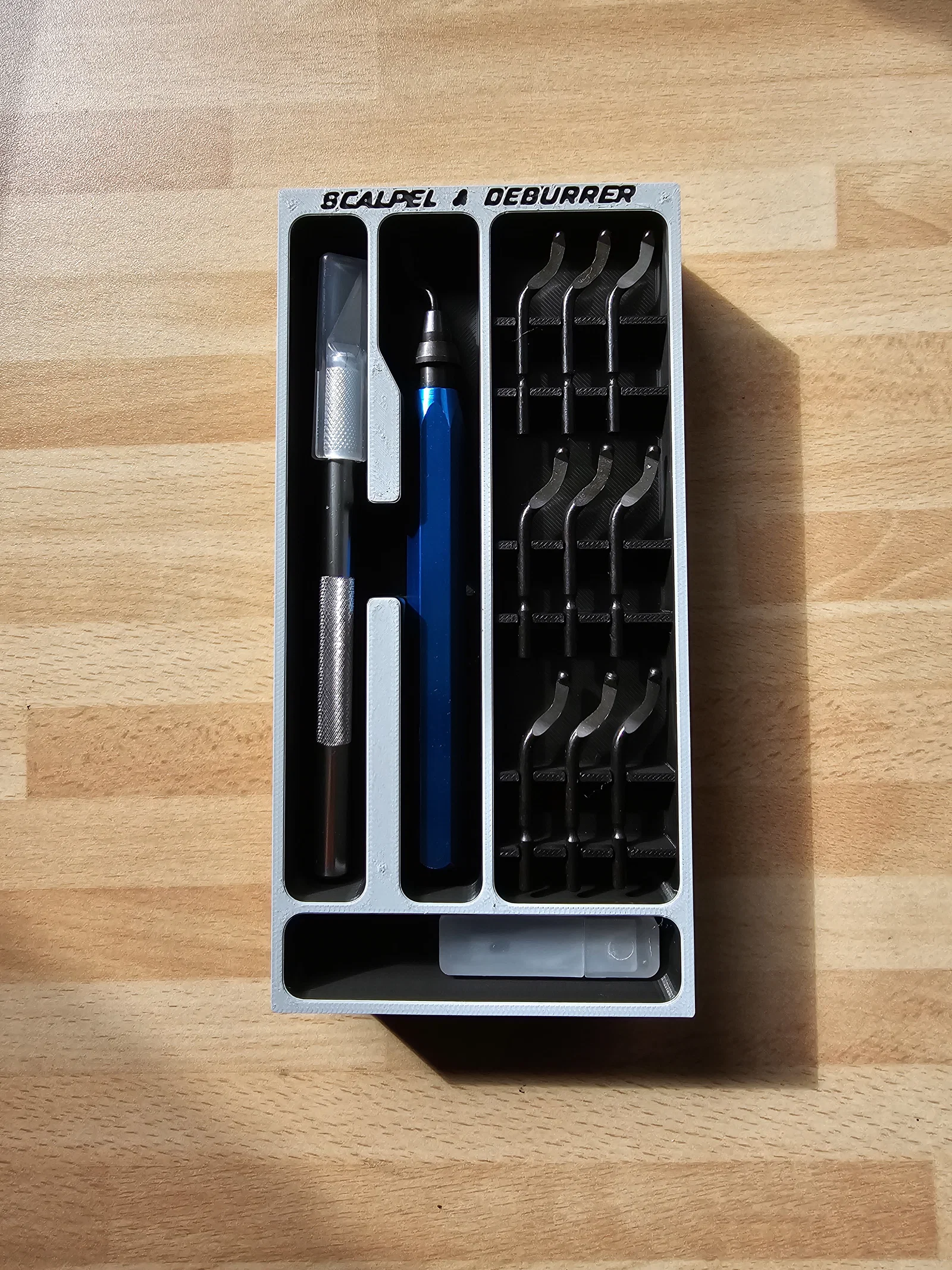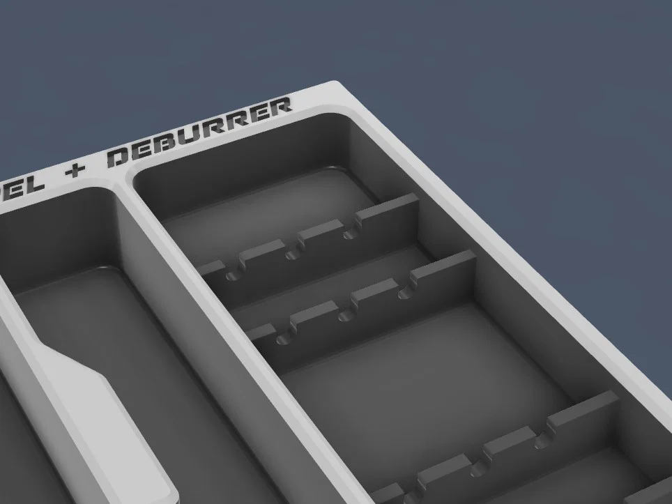 Miếng lót (insert) này được thiết kế để giữ dao mổ (scalpel) và dụng cụ gỡ ba-via (deburrer) cùng các phụ kiện đi kèm, là một phần mở rộng cho hệ thống tuyệt vời từ @Willi. Hãy ghé thăm trang của anh ấy để xem thêm nhiều mô-đun và phụ kiện thú vị khác nhé.