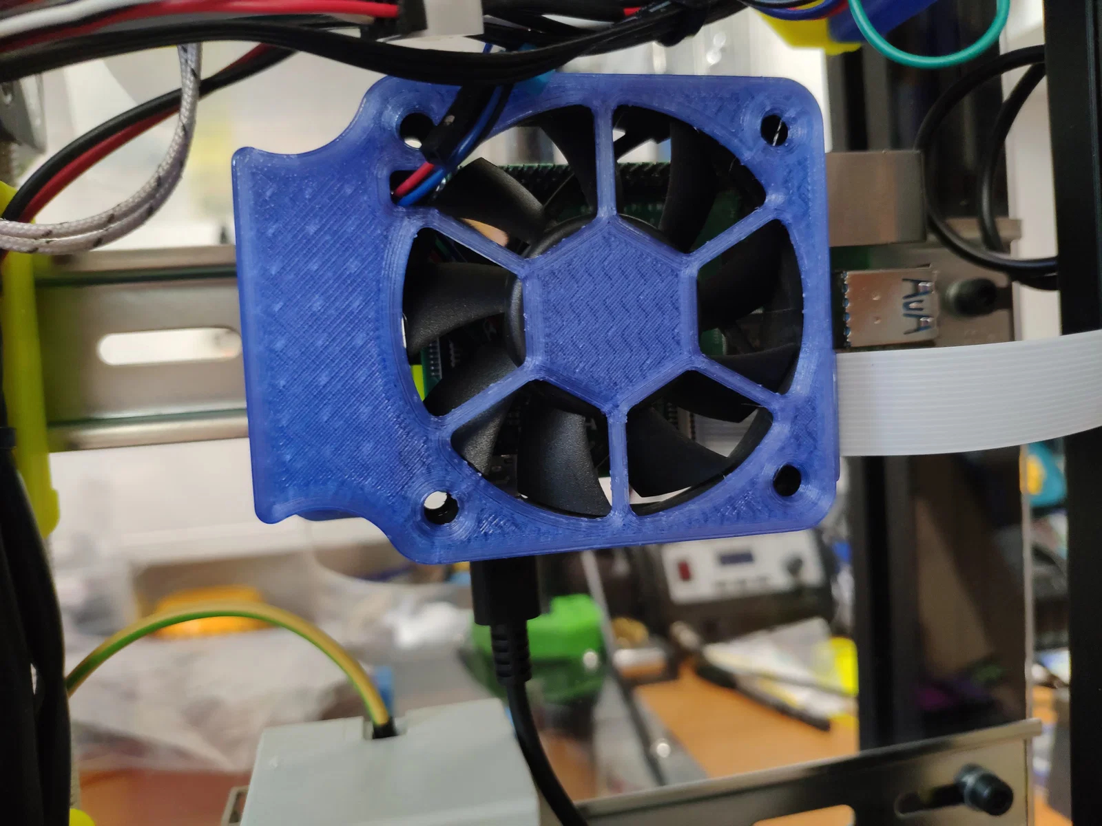Ngàm gắn quạt có các ngàm kẹp để giữ quạt cố định, tôi không cần dùng vít cho quạt. Ngàm này dành cho quạt 60mm (60x60x13.5). Có sẵn phiên bản kèm khe đi dây cho Camera Raspberry Pi và phiên bản không có khe.