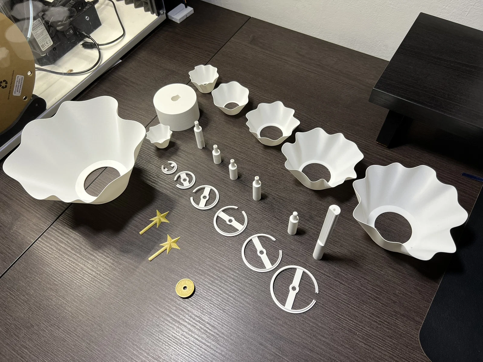 - In các phần tán cây (shades) ở chế độ Spiral Vase mode với đầu in 0.4 hoặc 0.6 mm, chiều cao lớp in tùy chọn (mình dùng 0.28 mm).