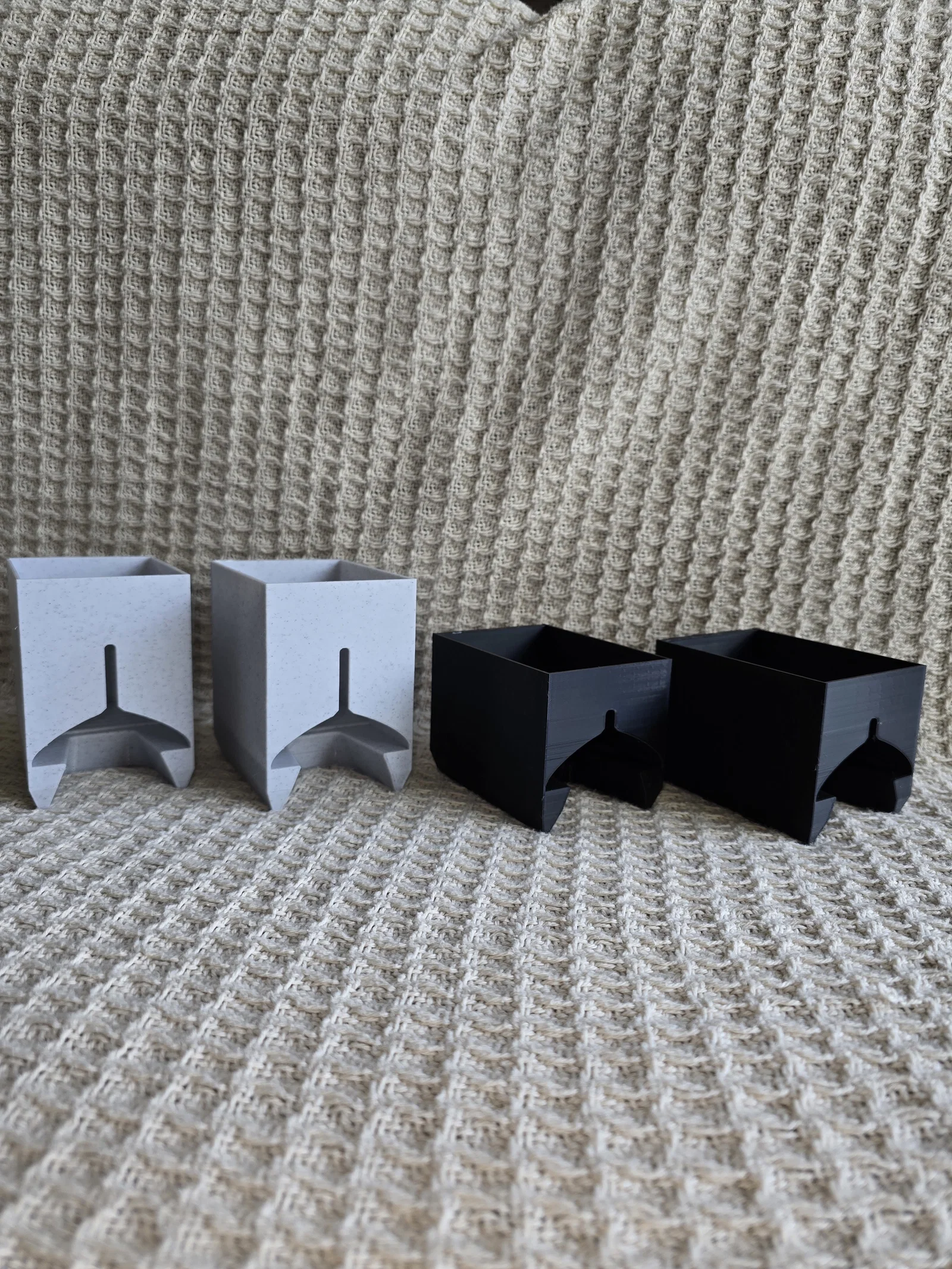 Mình in loại nhỏ bằng nhựa SUNLU Black PLA và loại lớn bằng DURAMIC 3D Marble PLA+, cả hai đều mua trên Amazon.