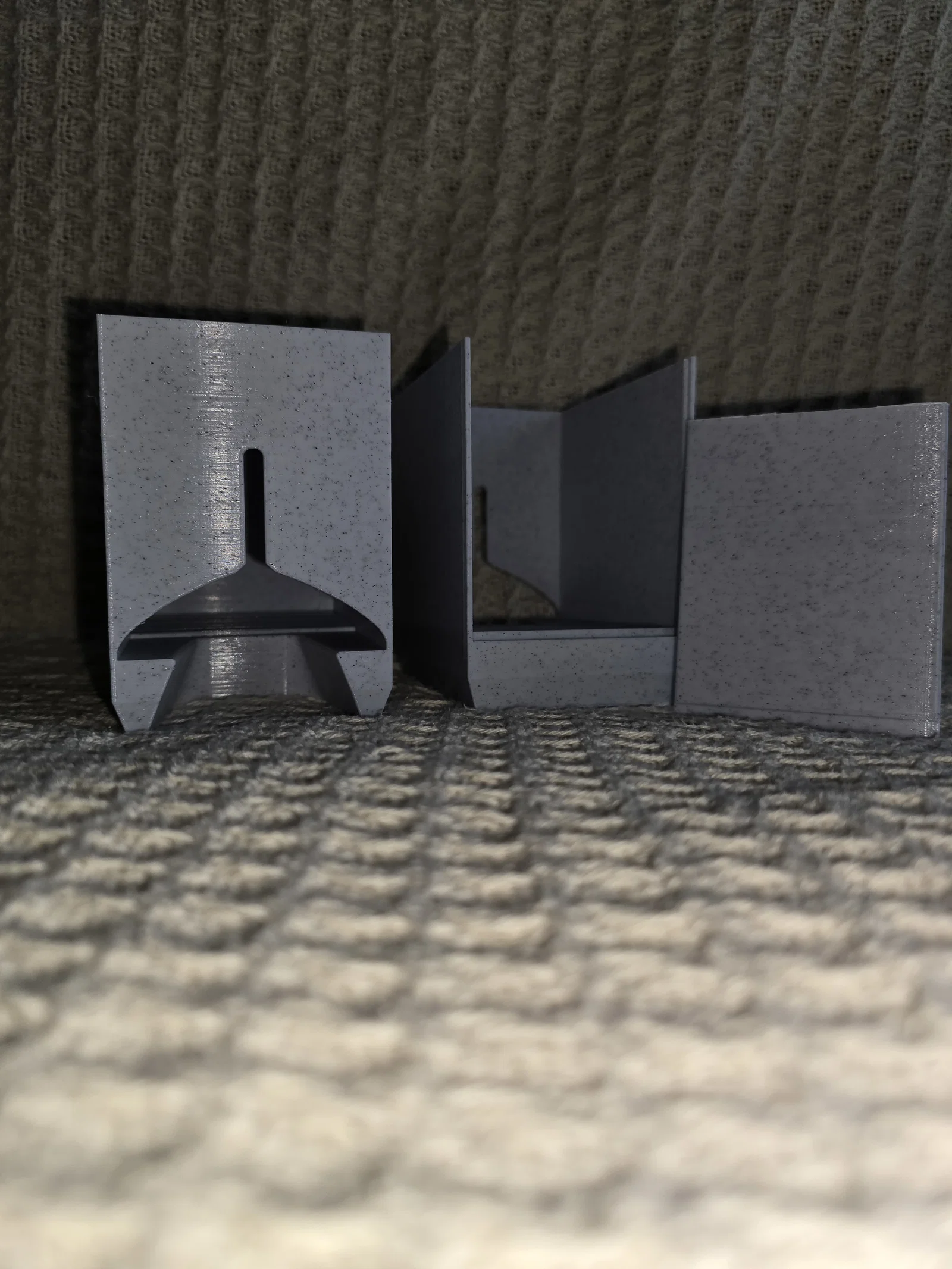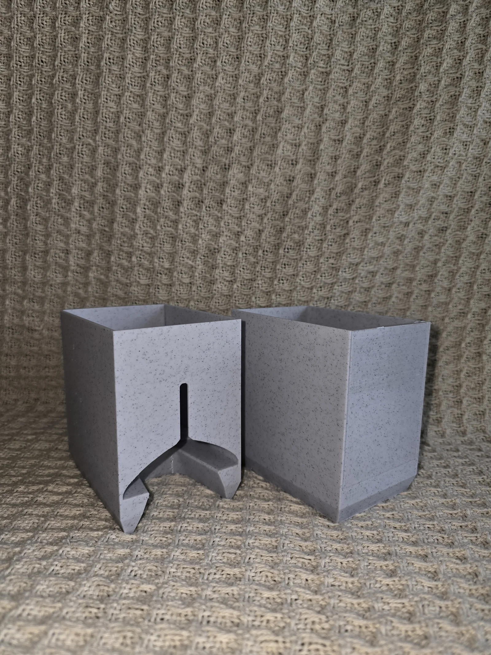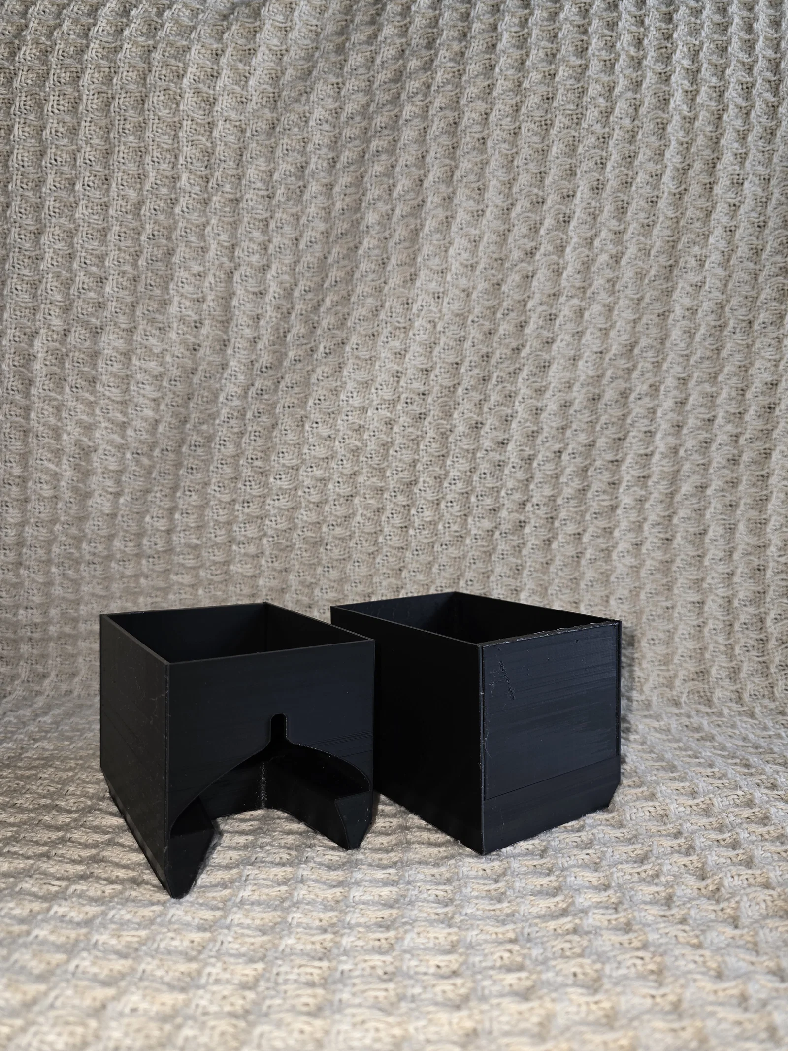 Phần đáy bên trong được làm vát giúp việc rút bài thuận tiện hơn. Phần đế ngoài cao 2cm với khoảng hở rộng, giúp ngón tay dễ dàng lấy bài (đồng thời đóng vai trò làm tạ giúp hộp không bị đổ). Các vách ngăn được thiết kế mỏng để tiết kiệm không gian và in nhanh hơn.