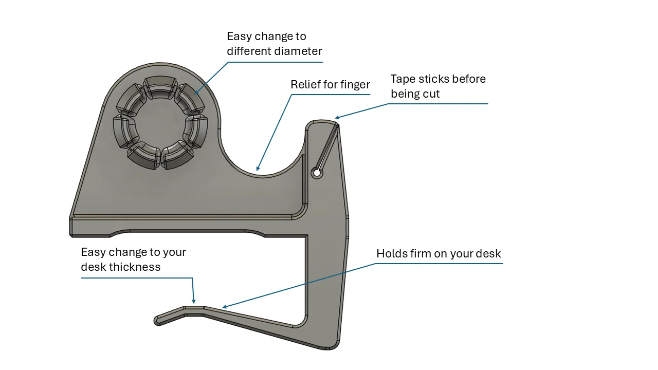 Một mẫu giá đựng băng keo thông minh với thiết kế có giá đỡ giữ băng keo luôn căng và lưỡi cắt kim loại sắc bén. Sản phẩm được kẹp chắc chắn vào cạnh bàn, giúp bạn thao tác dễ dàng chỉ bằng một tay. Thiết kế có thể tùy chỉnh kích thước theo độ dày mặt bàn.