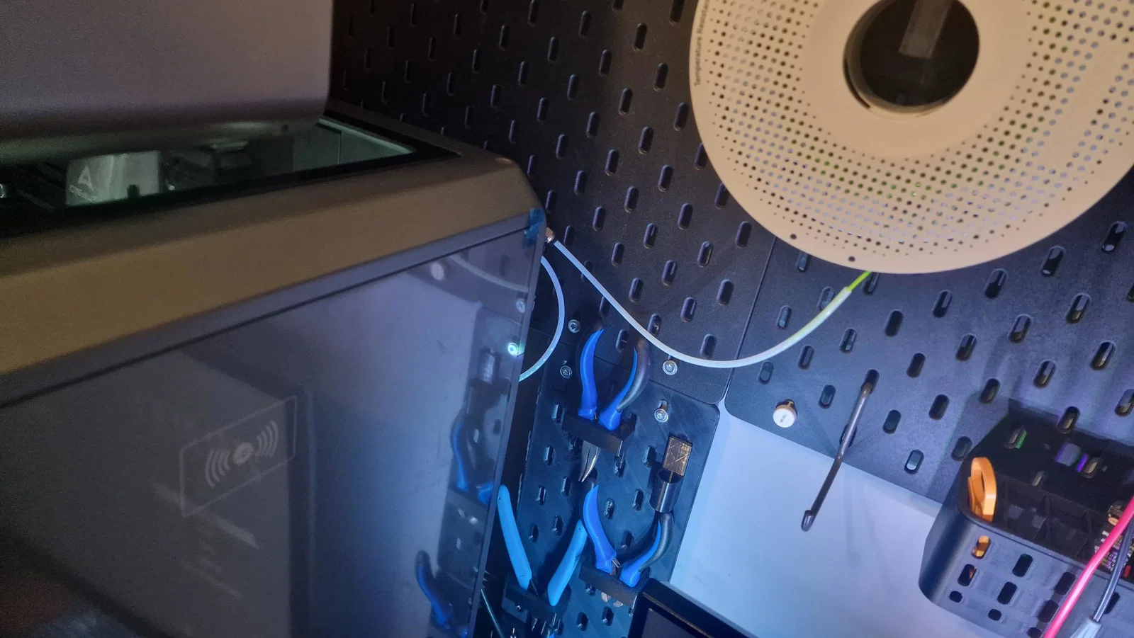 Hiện tại, mình đang gắn cuộn sợi bên ngoài lên bảng pegboard thay vì gắn ở cạnh bên của máy in.