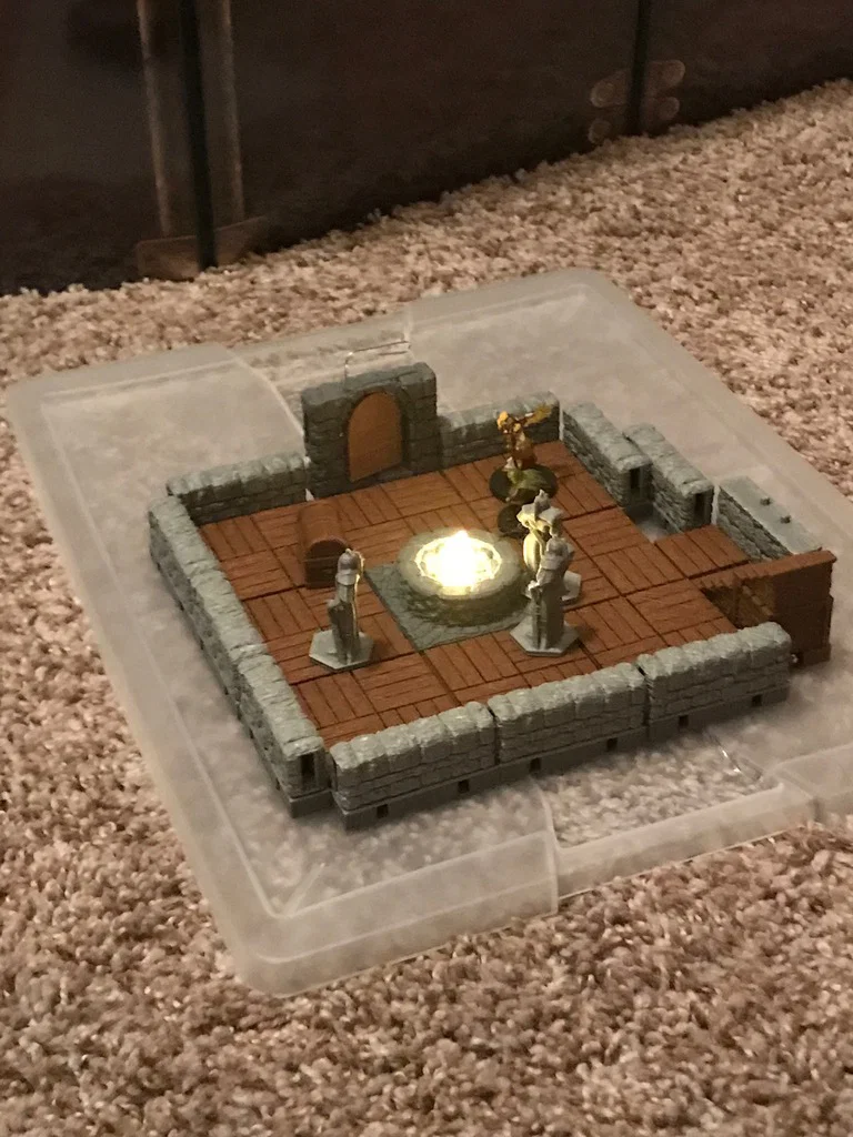 Mình đã remix lại mẫu đống lửa trại để bạn có thể đặt vừa một chiếc đèn trà (tea light) của IKEA... việc này cũng đòi hỏi phải tinh chỉnh lại phần đế mà mình hay dùng, đó là loại đế nam châm. Mình thấy loại đế này cực kỳ lý tưởng cho các trò chơi trên bàn (tabletop gaming) vì nam châm rất chắc chắn, cộng thêm các khe ở hai bên giúp nam châm tiếp xúc trực tiếp với nhau.