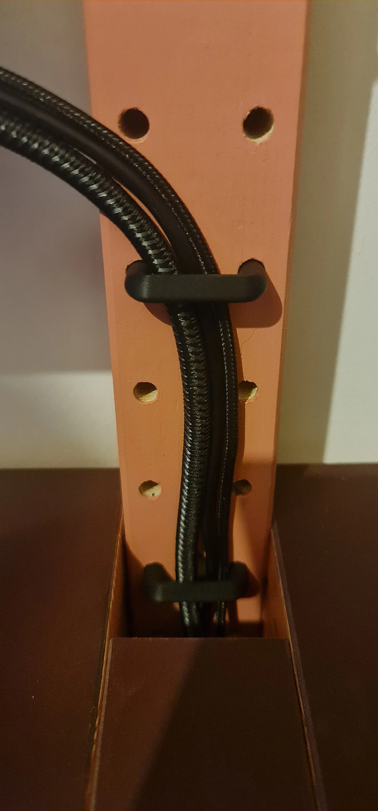 Một chiếc móc dạng cung đơn giản có thể gắn vào các lỗ trên kệ Ikea Ivar để hỗ trợ quản lý dây cáp gọn gàng.