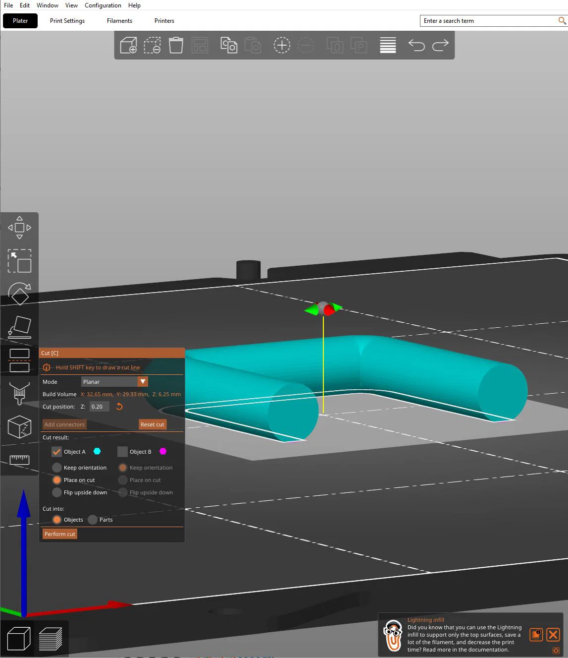 Nếu bạn gặp vấn đề với độ bám dính trên bàn in, mình khuyên bạn nên cắt bớt phần đáy của mô hình bằng phần mềm slicer mà bạn đang dùng (xem ảnh chụp màn hình). Chỉ cần cắt khoảng 1 hoặc 2 lớp in là đủ. Cách này sẽ giúp tăng diện tích bề mặt tiếp xúc với bàn in.