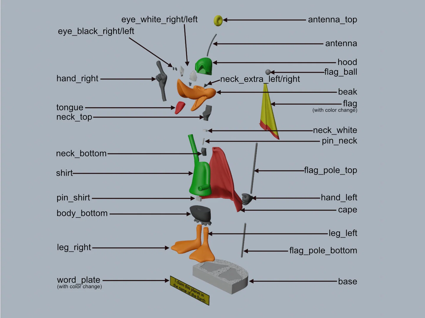 Mẹo lắp ráp: 1 - Hãy kiên nhẫn khi dán keo. 2 - Mình dùng 3D Gloop và E6000. E6000 giúp bạn có thêm thời gian căn chỉnh, còn 3D Gloop khô rất nhanh và tạo liên kết bền. 3 - Nên gắn tay phải cùng cột cờ sau cùng để căn chuẩn vị trí. 4 - Sau khi lắp mũ/cổ/mỏ, hãy gắn mắt và các phần cổ phụ. 5 - Phần neck_white gắn vào neck_bottom bằng pin_neck. 6 - Tham khảo kỹ hình ảnh lắp ráp đi kèm. Mô hình này được thiết kế để dán keo.