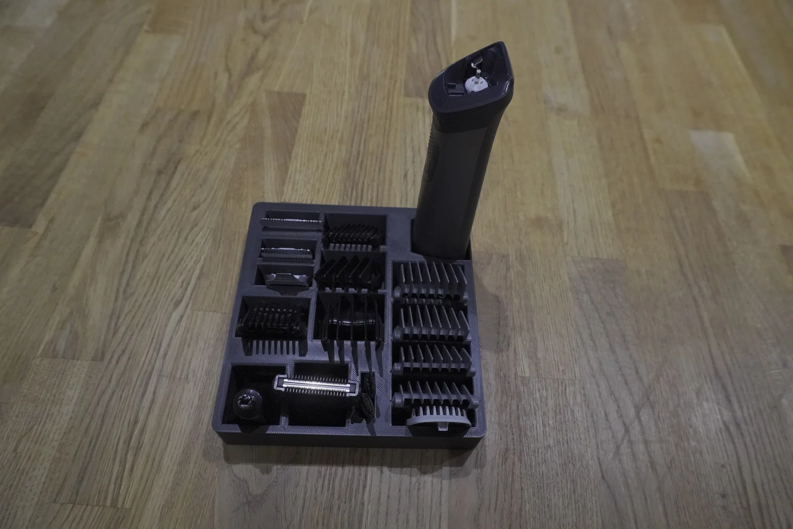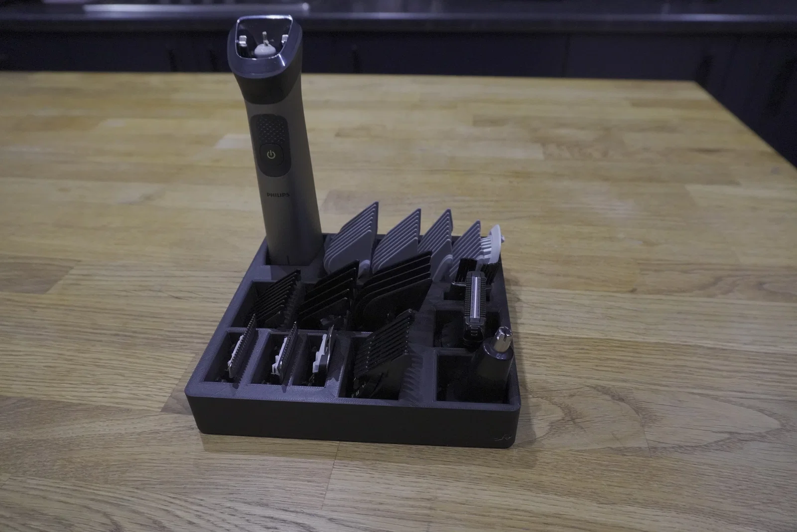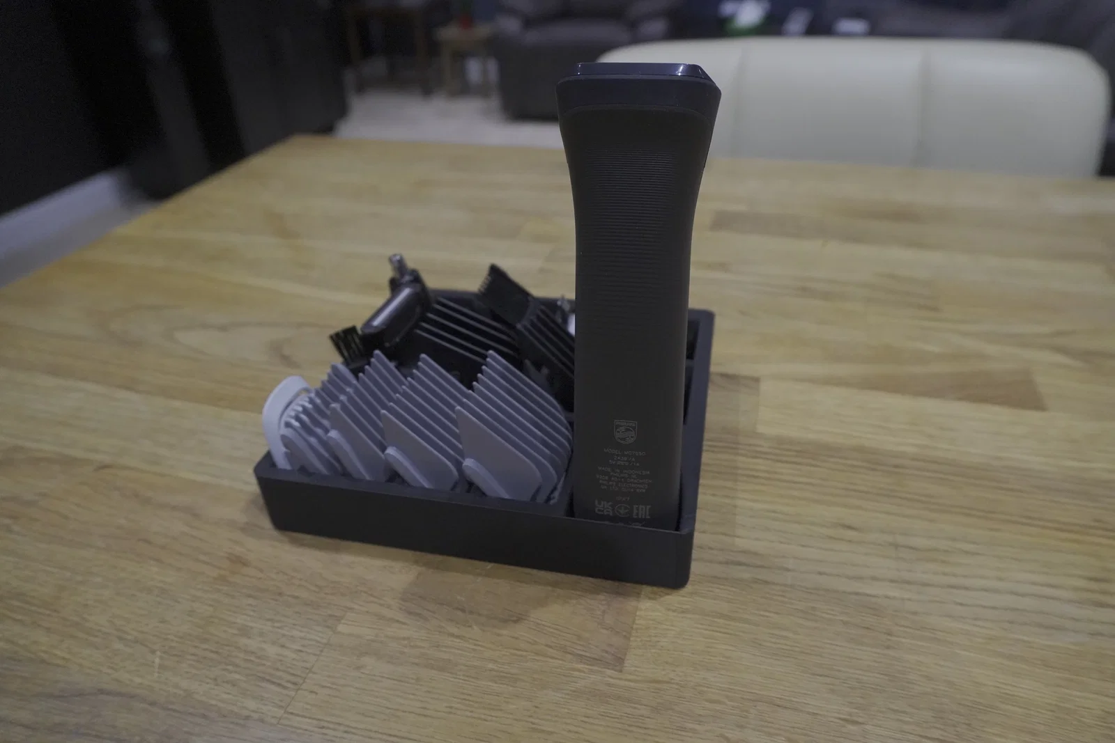 Đế cắm tiện lợi cho máy Philips 7000 series 15-in-1 (Model MG7950/15). Thiết kế gọn gàng giúp anh em sắp xếp đầy đủ các đầu phụ kiện và cọ vệ sinh vào một chỗ, tránh tình trạng thất lạc linh kiện sau khi sử dụng.