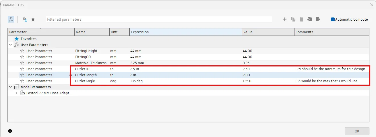 - Thiết kế dạng Parametric trong Fusion 360: Dễ dàng thay đổi các thông số như OutletID, OutletLength, và OutletAngle.