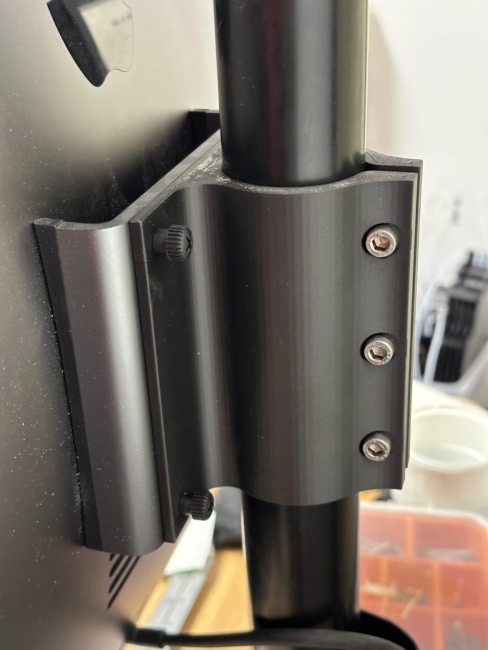 Đây là thiết kế ngàm cố định đơn giản để gắn màn hình vào cột. Mình không cần điều chỉnh gì nhiều nên muốn một thiết kế gọn gàng, tiết kiệm diện tích cho bàn làm việc hẹp. Mình có đính kèm file Fusion để mọi người tiện tùy chỉnh hoặc căn chỉnh nếu cột bị lệch.