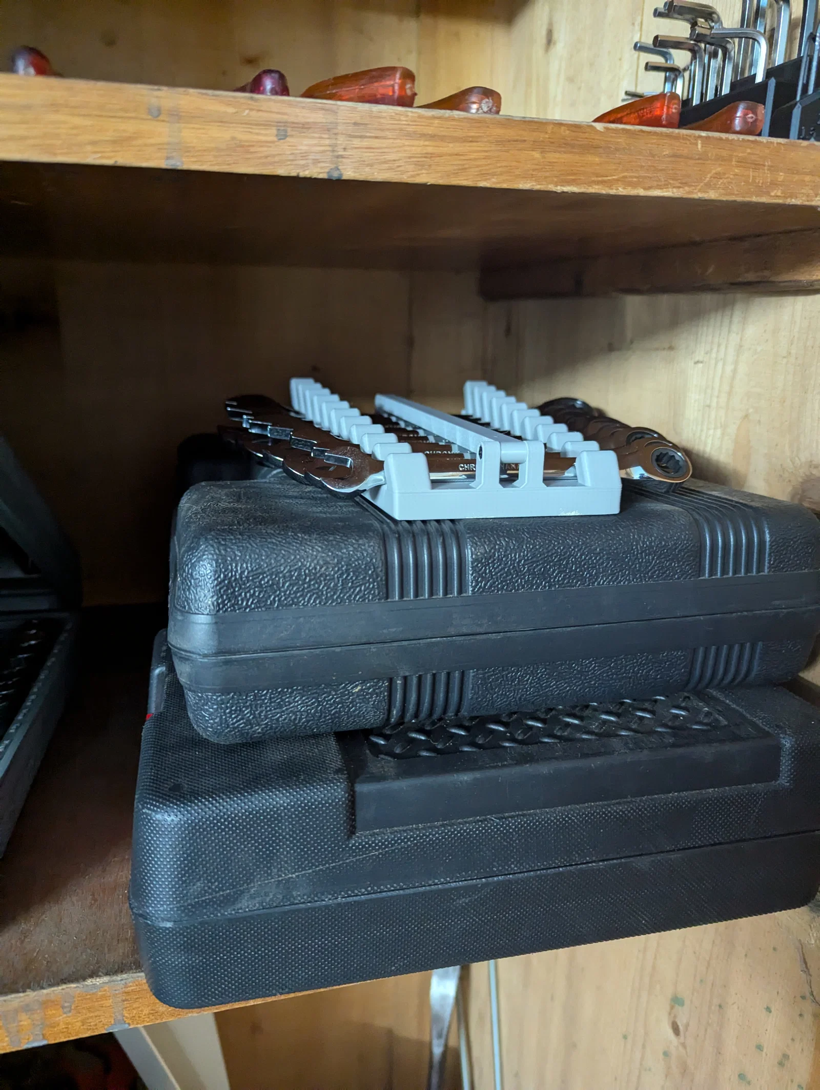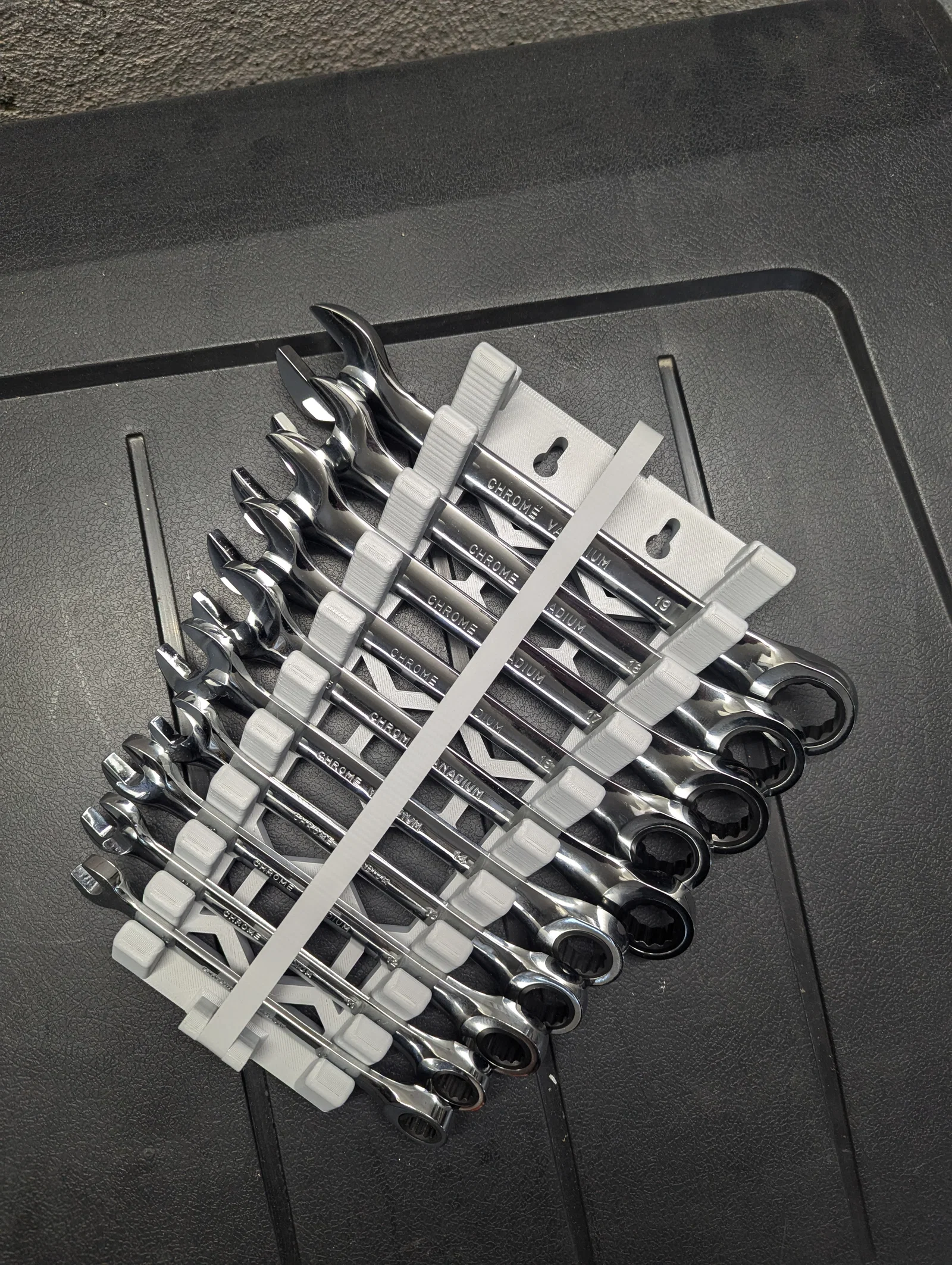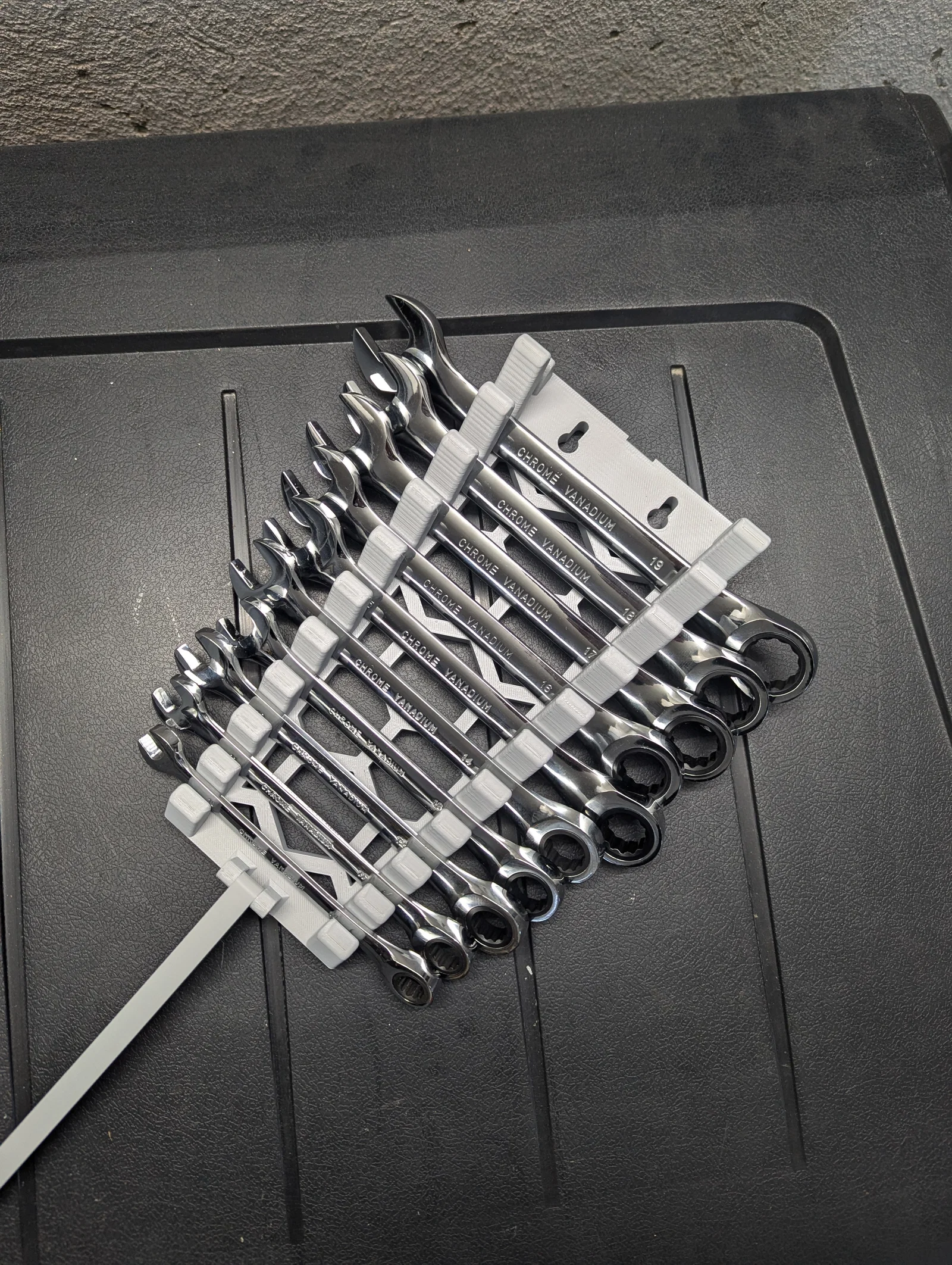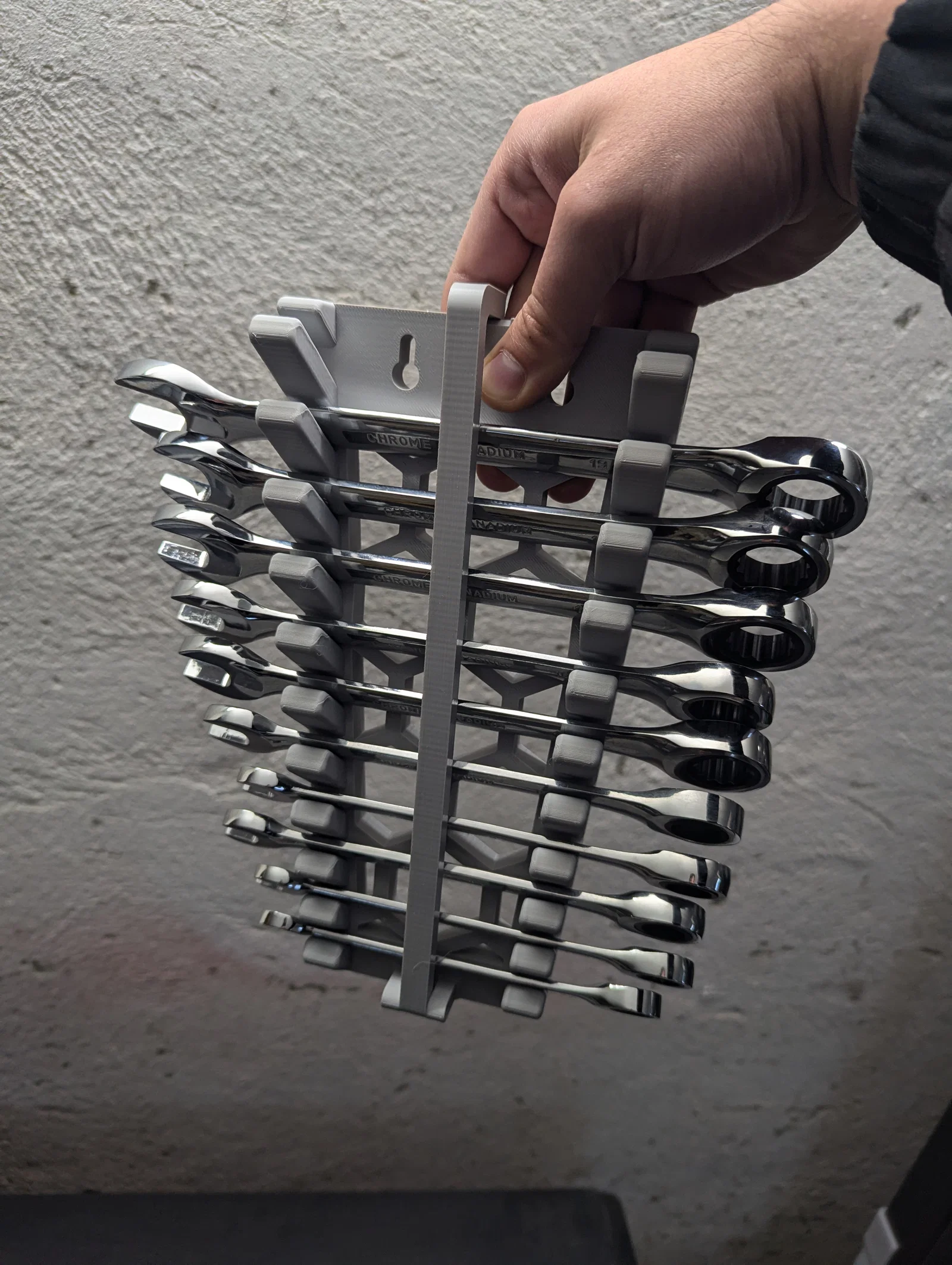 Đây là mẫu giá đỡ cờ lê có kèm kẹp để giữ dụng cụ chắc chắn hơn. Bạn có thể dễ dàng gắn giá lên tường để sắp xếp đồ đạc gọn gàng. Thiết kế này phù hợp với nhiều loại cờ lê tiêu chuẩn và không cần dùng support khi in 3D.