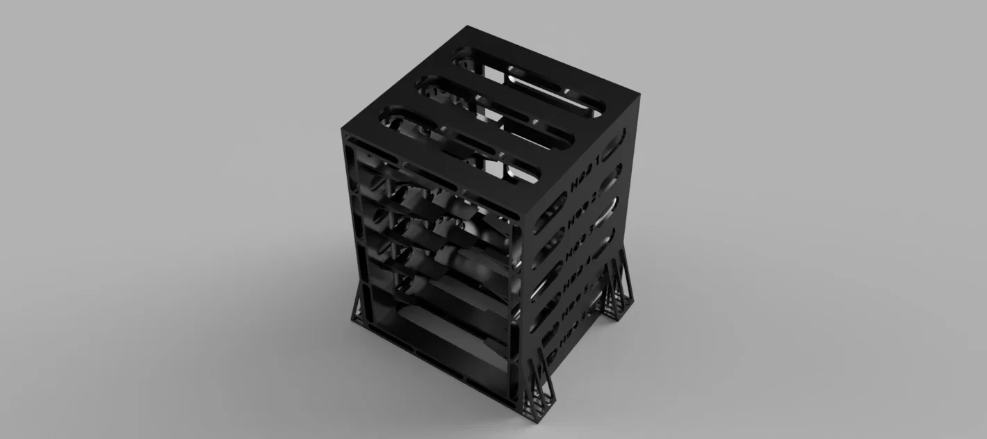 Bộ giá đỡ 6 khay cho ổ cứng HDD gắn ngoài, thiết kế thông minh có lỗ tản nhiệt, không cần dùng support khi in. Thời gian in khoảng 8 tiếng 28 phút với khối lượng nhựa 93g trên dòng máy MINGDA Magician X2.