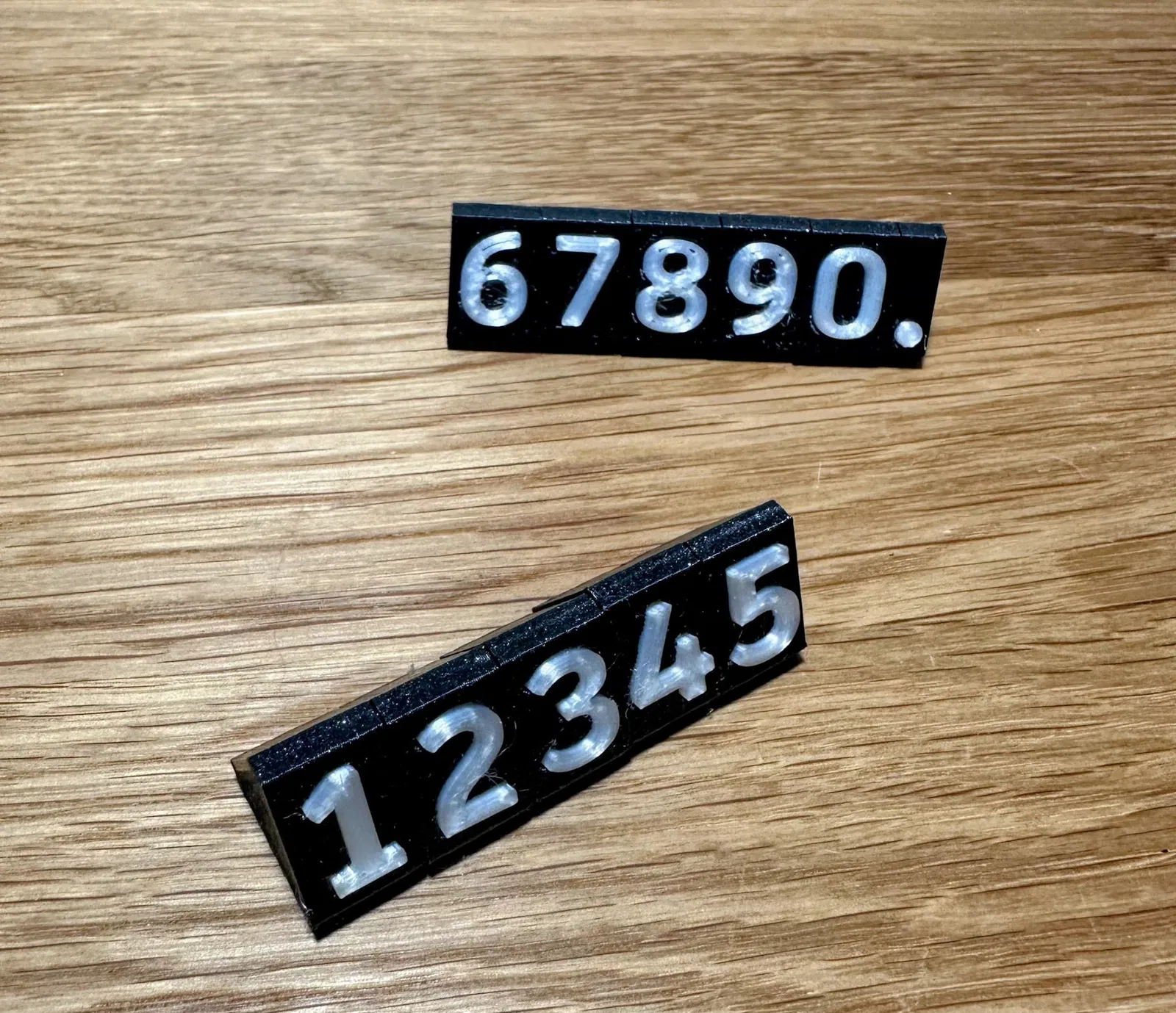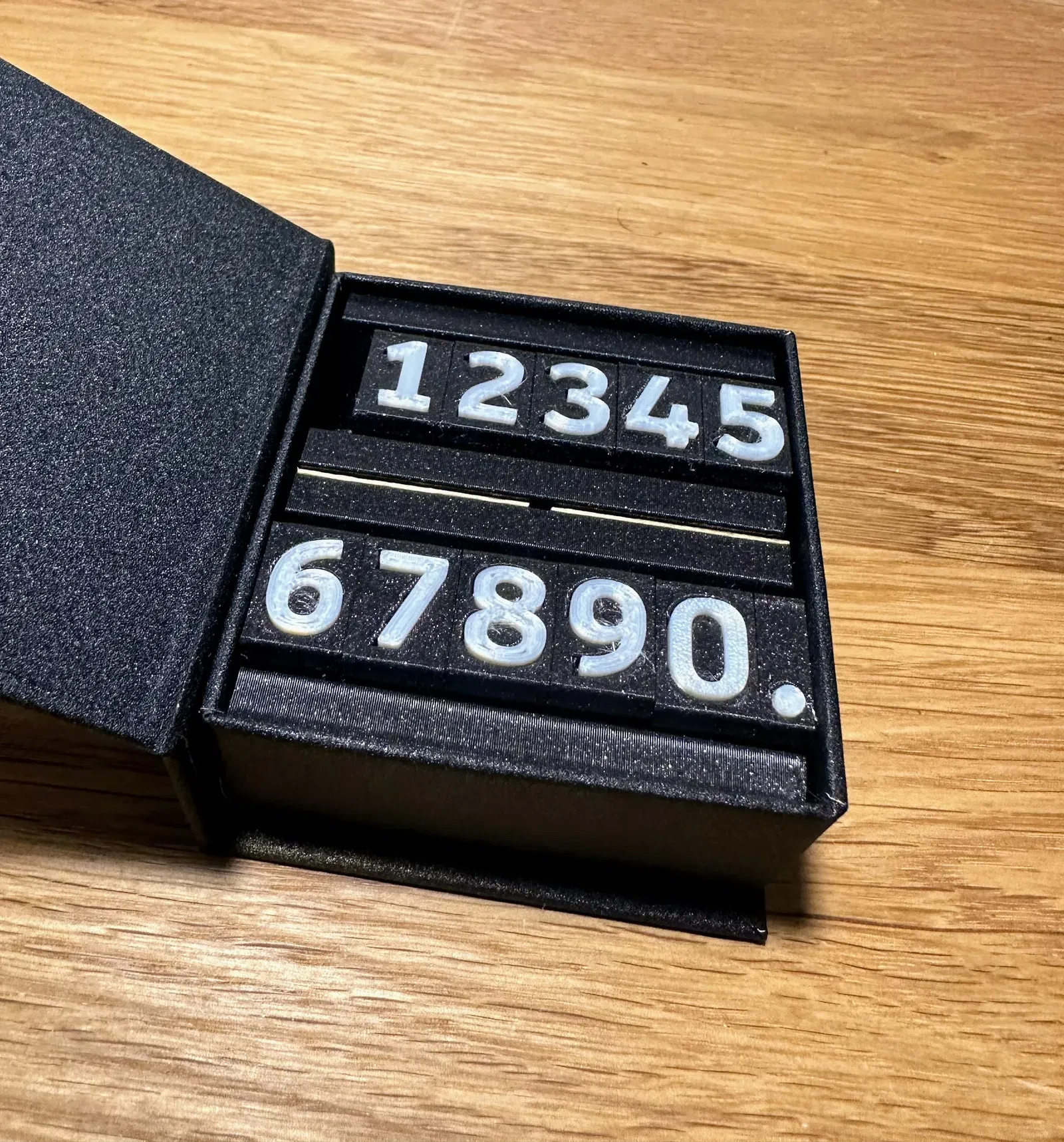 Bạn sẽ cần in các khối số với một khoảng dừng in ở chiều cao in 9.6mm, để chèn nam châm. In mảnh “magnet-guide” như một trợ giúp để đảm bảo tất cả các số sẽ có cực nam châm đúng. Nam châm nên kéo về phía mảnh “magnet-guide”, bên nào kéo về phía nó sẽ được chèn “xuống” vào khối số - kéo về phía tấm xây dựng.