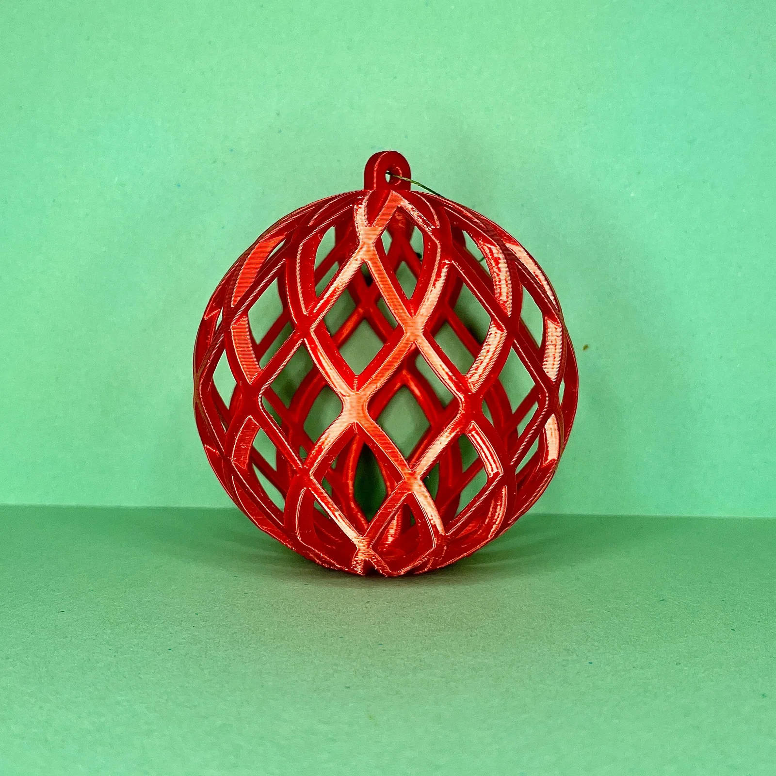 Một mẫu quả cầu trang trí Giáng sinh đầy tinh tế với thiết kế họa tiết kim cương! Sản phẩm trong hình được in bằng máy Creality K1C, sử dụng đầu phun 0.4mm và chiều cao lớp in 0.24mm. Phần đỉnh của quả cầu cần dùng support, mình đã sử dụng tính năng tự động tạo tree support và chỉ đặt support trên bàn in (build plate only) để đạt kết quả tốt nhất.