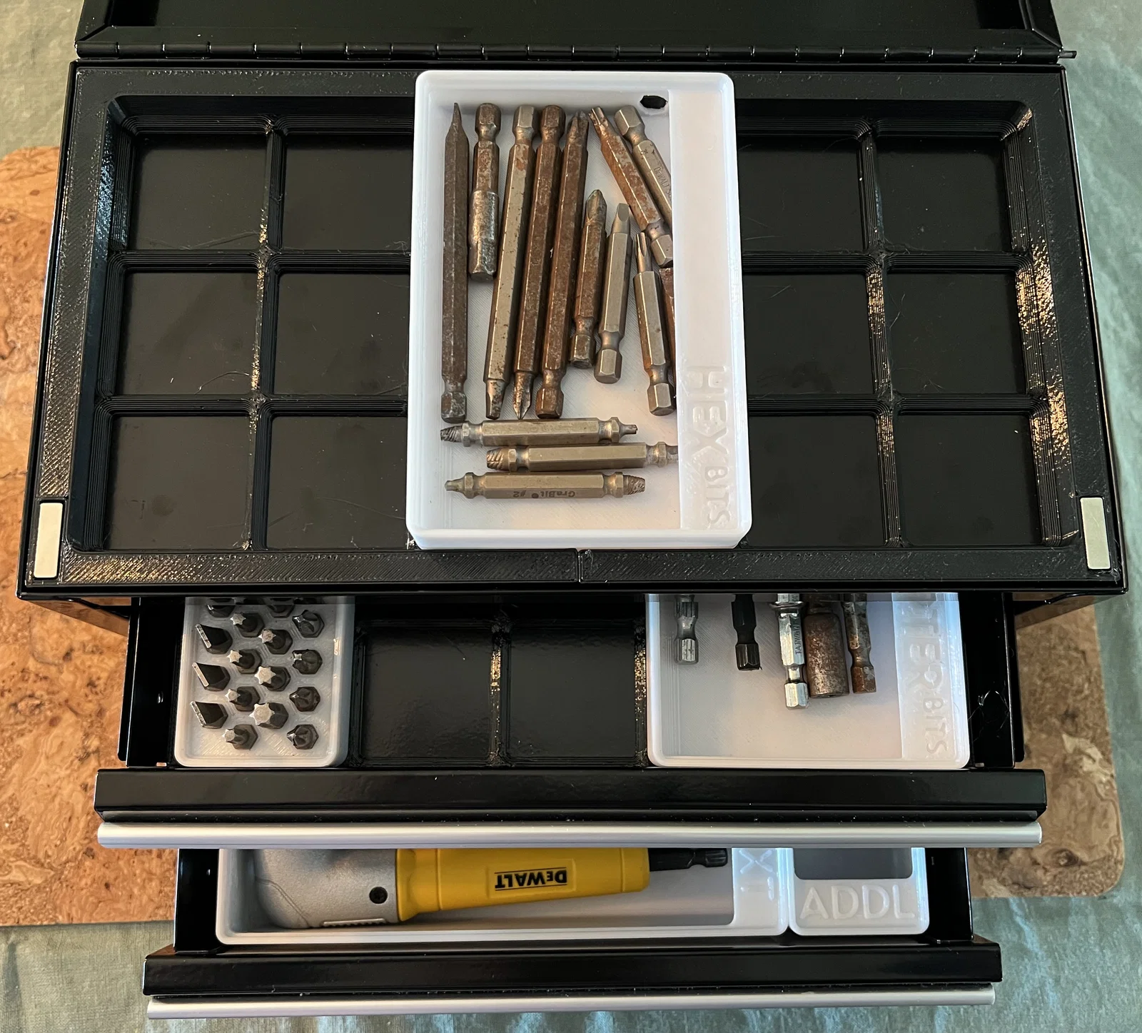 Mình rất thích mẫu nhưng phần đế lại dùng Clickfinity, trong khi mình thấy dùng chuẩn Gridfinity là ổn rồi. Thế là mình tự làm cái đế này dựa trên để khớp vừa khít với các ngăn kéo của hộp dụng cụ này.