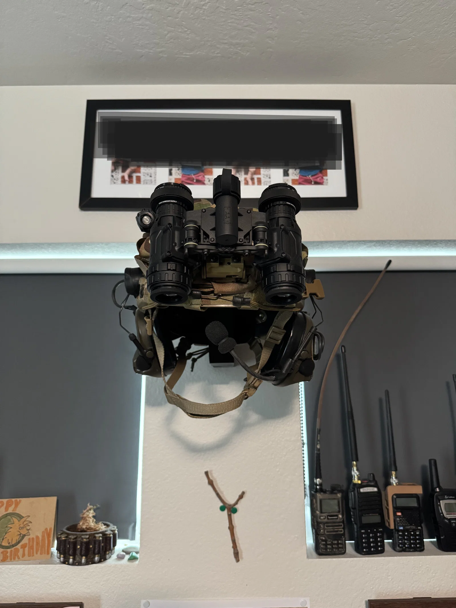 Mẫu giá treo tường tiện lợi dành cho mũ bảo hiểm tác chiến có gắn kính nhìn đêm (NVG/NODs). Thiết kế thông minh, có sẵn không gian phía sau để chứa battery pack, phù hợp với các loại túi đựng chuyên dụng như Agilite.