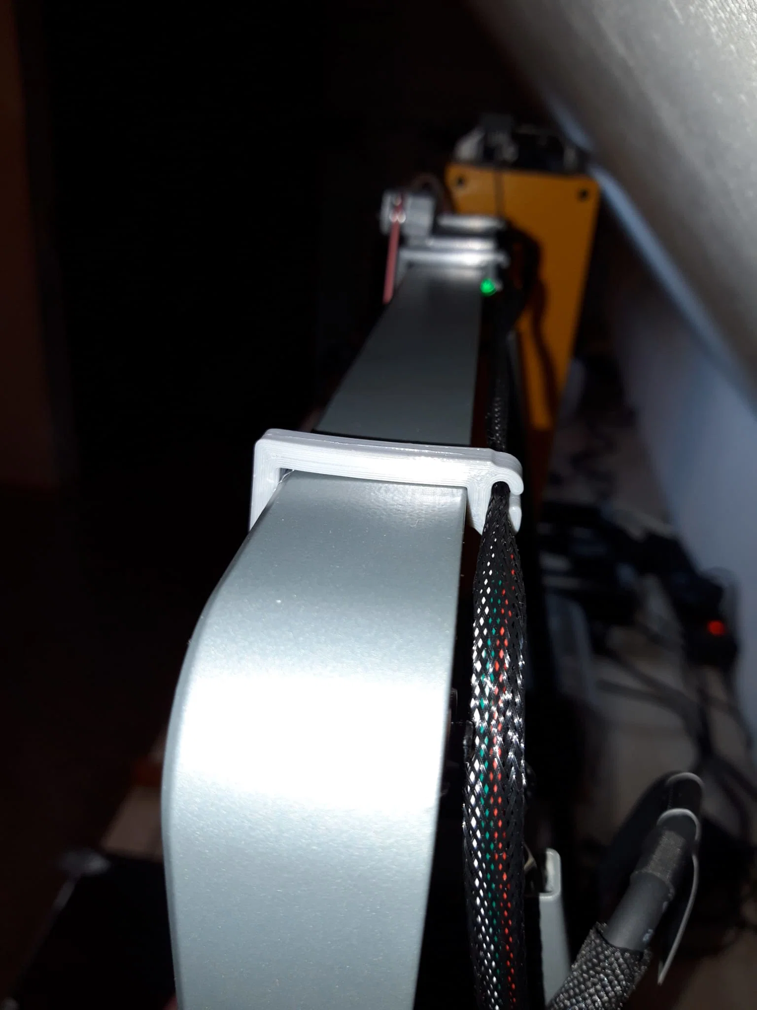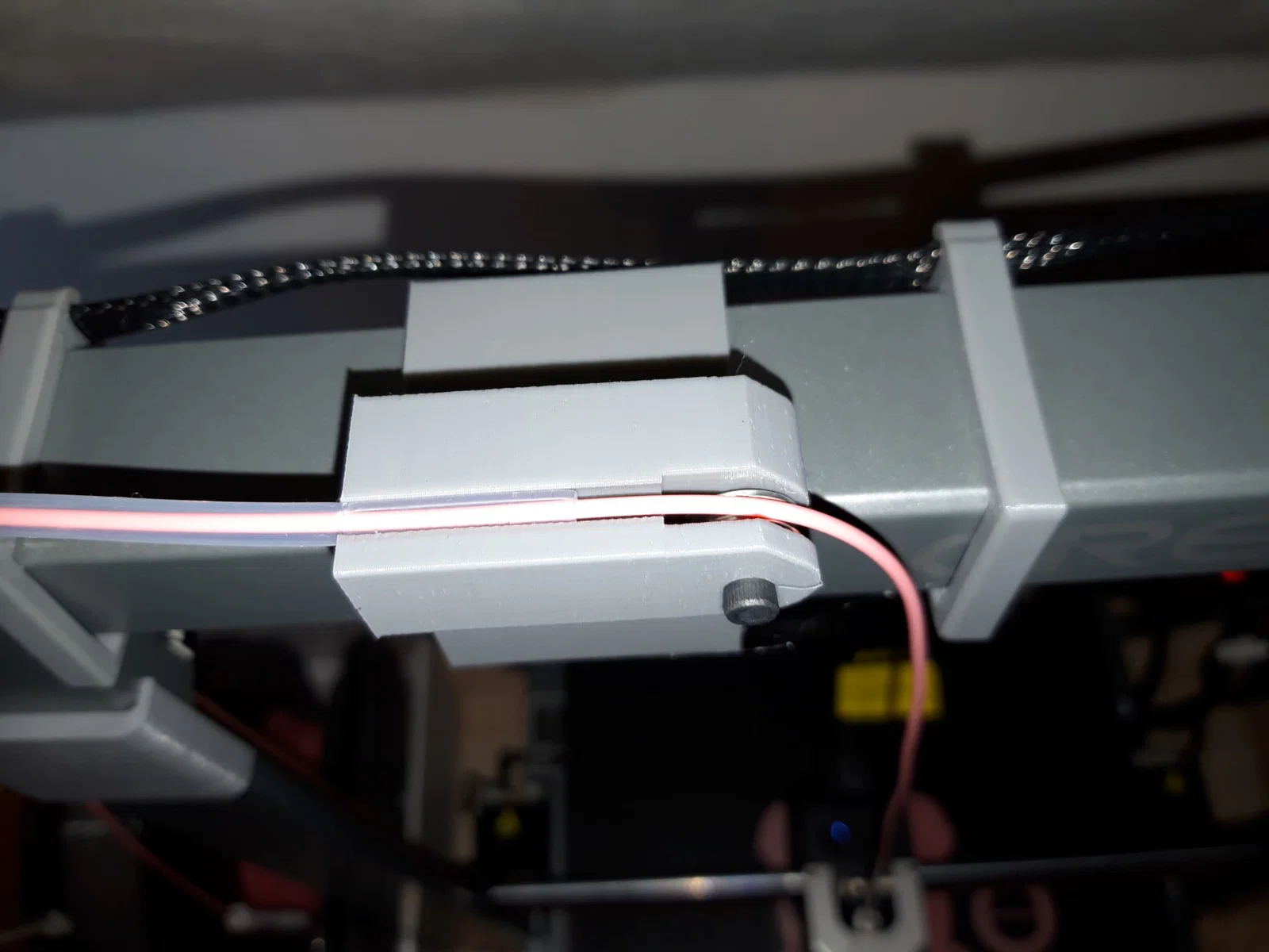 Cáp hotend và cáp cảm biến hết nhựa (runout sensor) mình đã gom lại và dẫn dọc theo thanh chống bên phải. Ống bọc cáp dạng mở nên bạn có thể rút dây cảm biến ra dễ dàng. Bạn nên luồn dây vào kẹp trước rồi mới gắn kẹp lên thanh ngang; kẹp được thiết kế khá khít để tránh dây bị tuột ra ngoài.