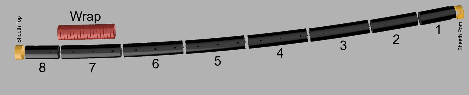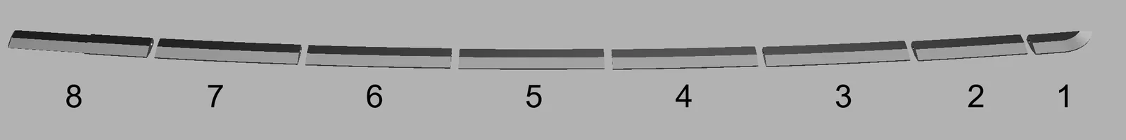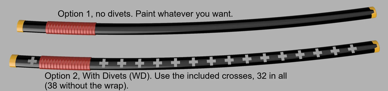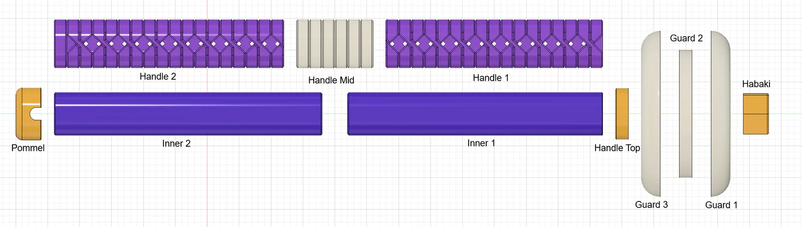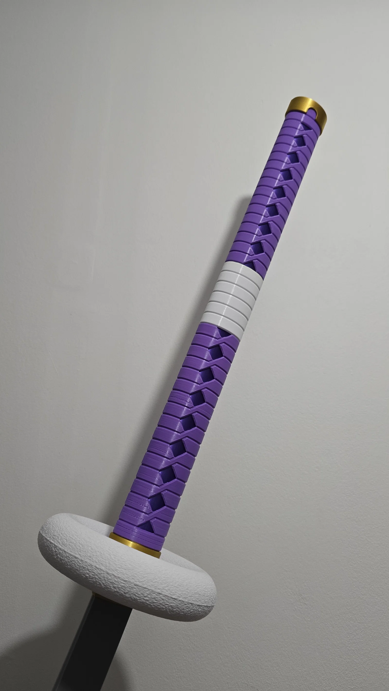 Kikoku từ One Piece, thanh kiếm được sử dụng bởi Trafalgar Law. Tôi muốn thử thách giới hạn của bản thân một chút với mẫu thiết kế này. CẢNH BÁO! MÔ HÌNH NÀY RẤT LỚN! CẬP NHẬT!!! Phần chuôi kiếm có không gian cho một thanh gỗ đường kính 15mm và dài 348mm. Phần lưỡi kiếm hiện đã sử dụng một thanh dài khoảng 1220mm, đường kính 5mm. (Lưỡi kiếm có chỗ trống để đặt các thanh kim loại đường kính 5mm. Tôi đã dùng nhôm: 1 thanh 230mm, 1 thanh 100mm, 5 thanh 130mm. Nó đủ cứng để cầm ngang nhưng cảm giác như sắp gãy… Còn cầm đứng lưỡi lên hoặc xuống thì không vấn đề gì. Thật không may là tôi làm rơi nên nó bị gãy, tôi đã rút ngắn bớt 2 phần và giờ cầm thấy vừa tay hơn nhiều.) Toàn bộ mô hình có dung sai chồng lắp là 0.1mm giữa một số chi tiết. Ví dụ giữa habaki và thành bao kiếm chỉ có 0.1mm nên tùy vào máy in mà bạn có thể cần chà nhám một chút. Để tạo hiệu ứng trên phần bảo vệ (guard), tôi đã sử dụng tính năng “fuzzy skin” trong phần mềm slicer và tôi nghĩ cách này hiệu quả hơn nhiều so với việc cố tạo hiệu ứng trong Fusion. Chiều dài tổng thể khoảng 169cm và phần lưỡi "nguyên bản" khoảng 130cm tính cả phần chuôi ẩn bên trong. Tôi cũng bao gồm file bao kiếm có và không có phần đục lỗ (WD) nếu bạn muốn sơn các hình chữ thập thay vì dán chúng lên. Sau khi lắp ráp xong, có lẽ tôi thấy sơn sẽ đẹp hơn. Tôi cũng đã thêm các chi tiết có sẵn support để việc cắt và in dễ dàng hơn. In trên máy Ender 3v2. Mất khoảng 160 giờ ở tốc độ 50mm/s với chiều cao lớp in 0.2mm. Hy vọng mọi người sẽ thích nó và chúc các bạn in vui vẻ!