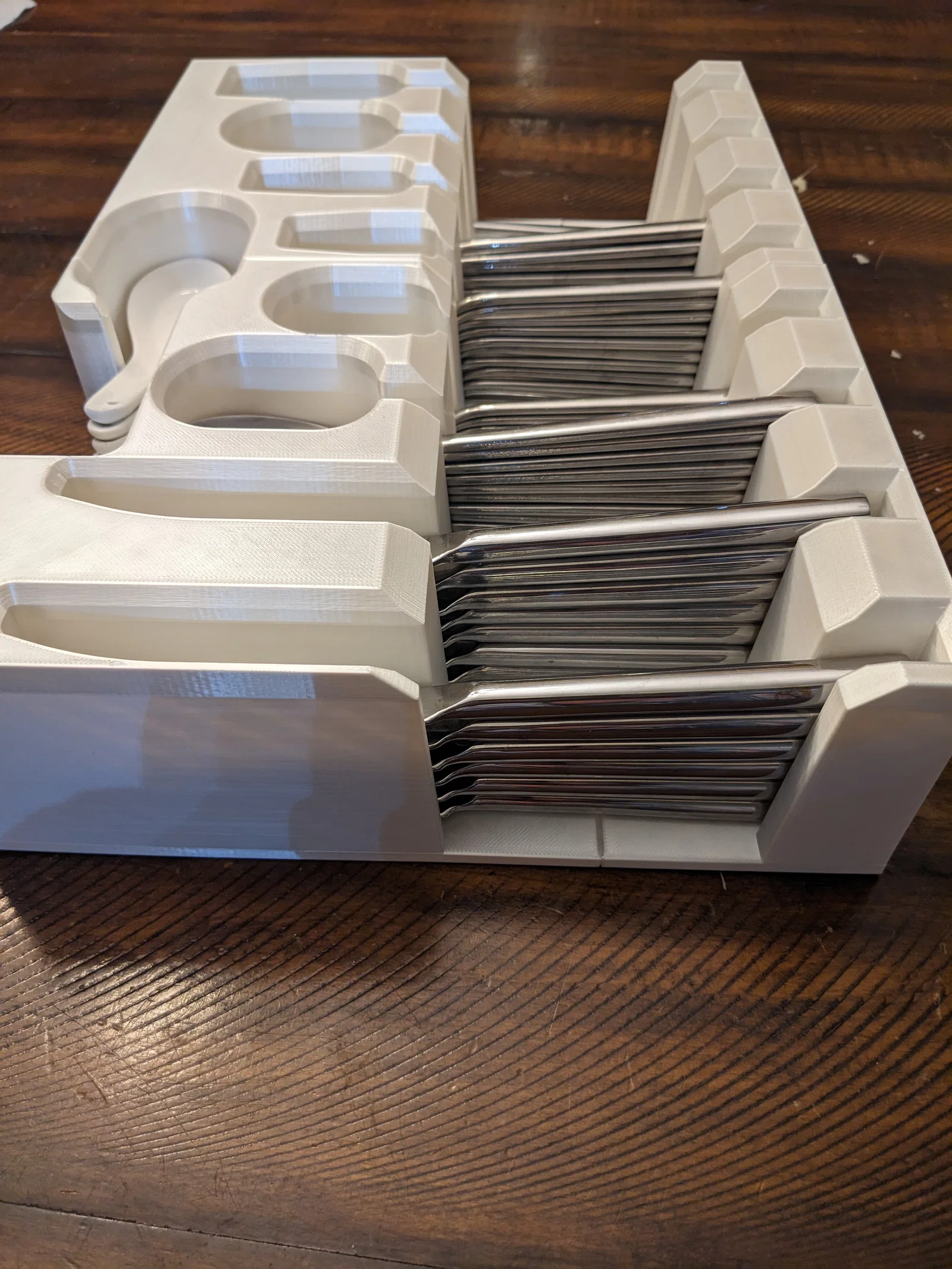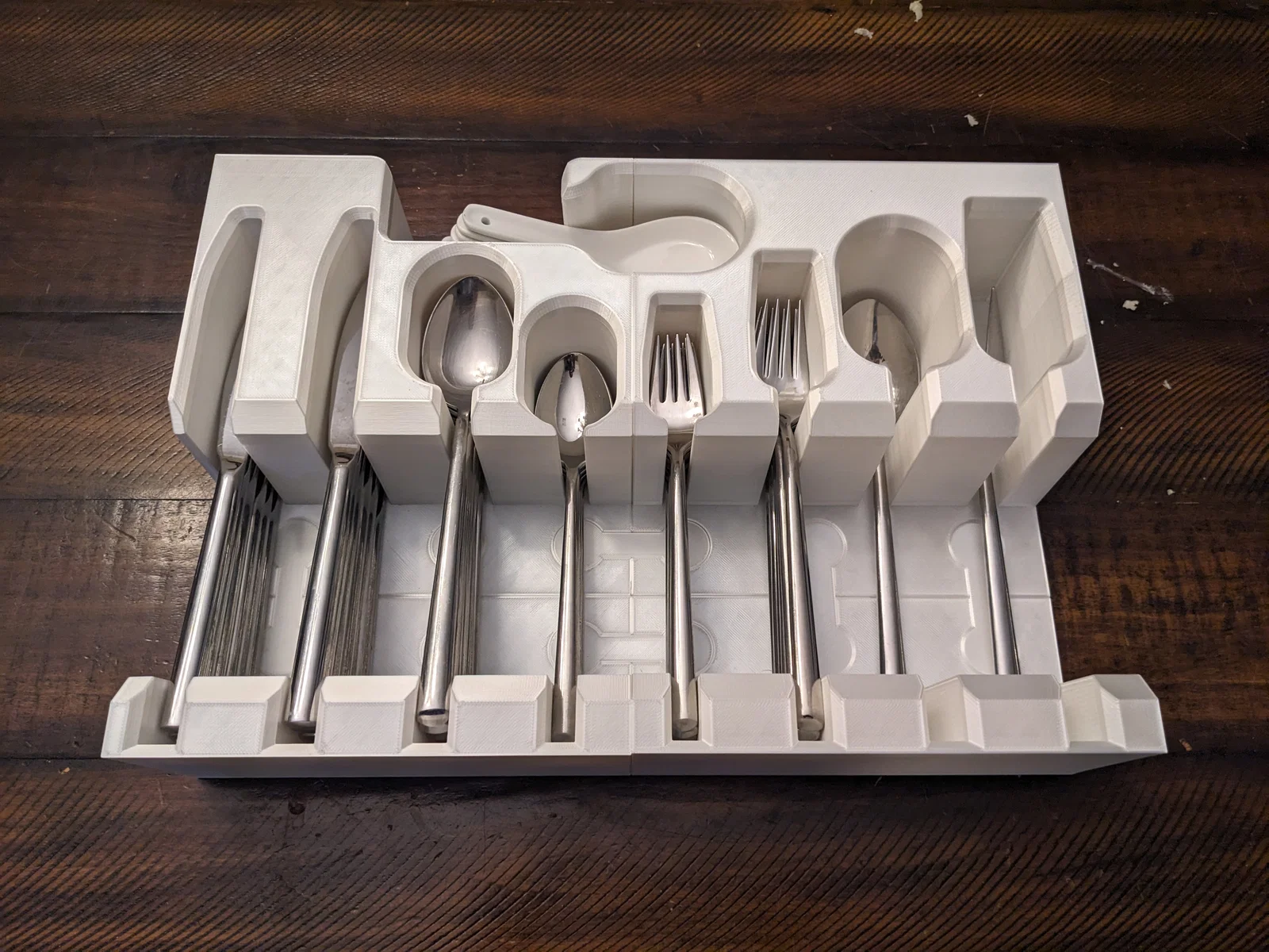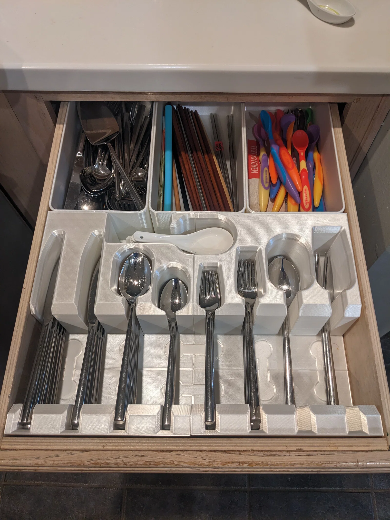 Mình đã thêm một vài khay phụ phía sau khay chính để đựng thêm muỗng nĩa, đũa, v.v. Chúng có chiều rộng đúng bằng một phần ba chiều rộng của khay đã lắp ráp và dài 250mm (vì đó là chiều dài bàn in của mình). Vẫn còn dư 16mm ở phía sau ngăn kéo, mình định in thêm miếng đệm để tránh bị trượt, nhưng vợ mình thông minh hơn nên đã gợi ý là chỉ cần chèn giấy vào là được. Cách này hiệu quả bất ngờ…