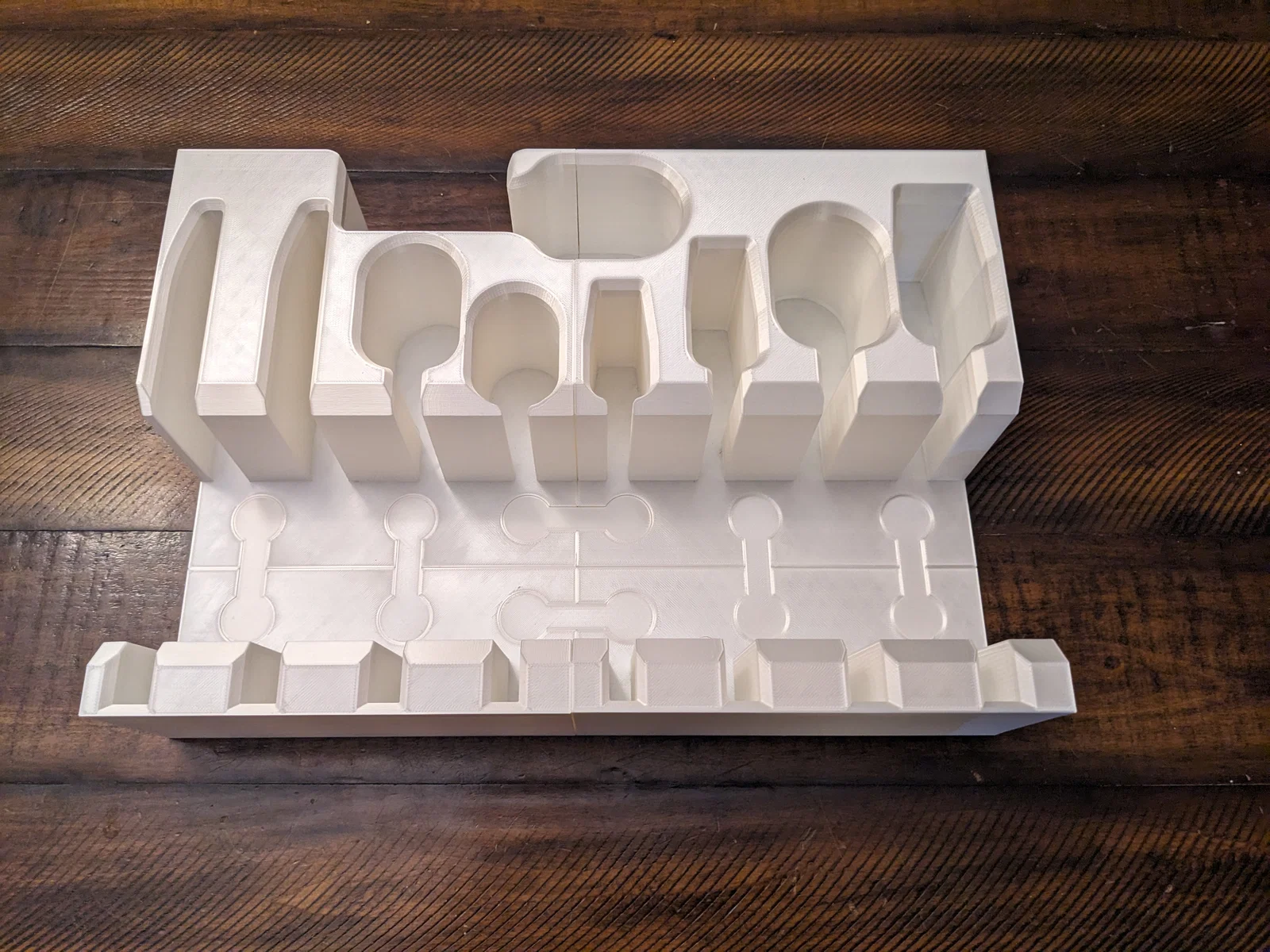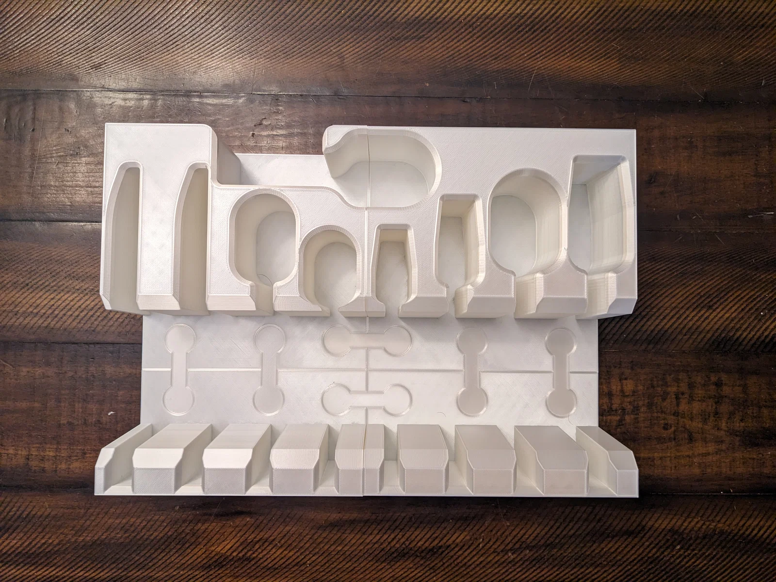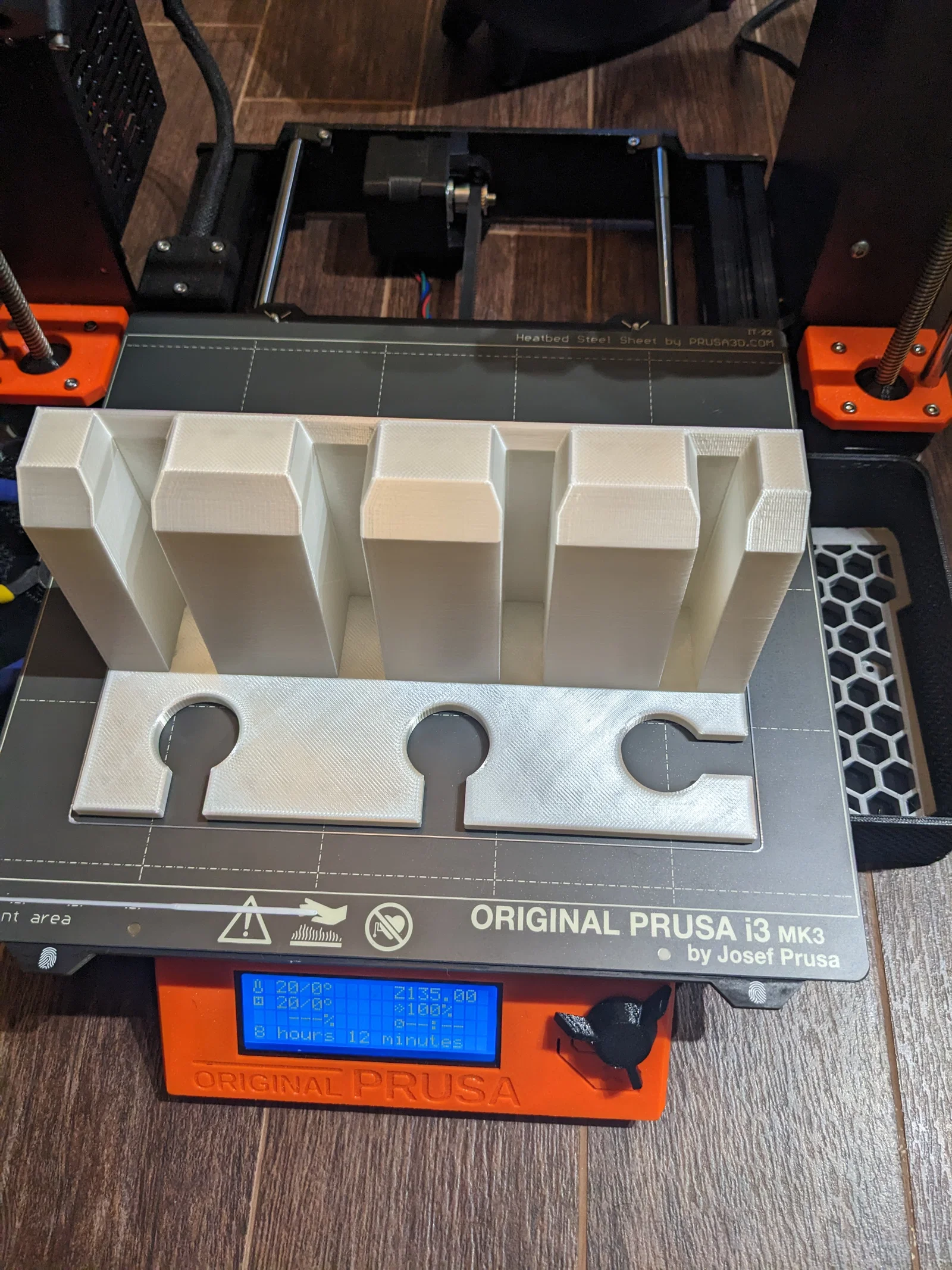 Vì để vừa trên bàn in MK3S+, mình phải chia nó thành 4 mảnh. Mình quyết định ghép các mảnh lại với nhau bằng chốt nối hình xương chó (dogbone) thay vì dùng keo, ốc vít hay ghim. Chúng giữ các mảnh lại với nhau khá chắc chắn trong ngăn kéo, nên mình thấy ổn, mặc dù chắc vẫn còn những cách khác tốt hơn.