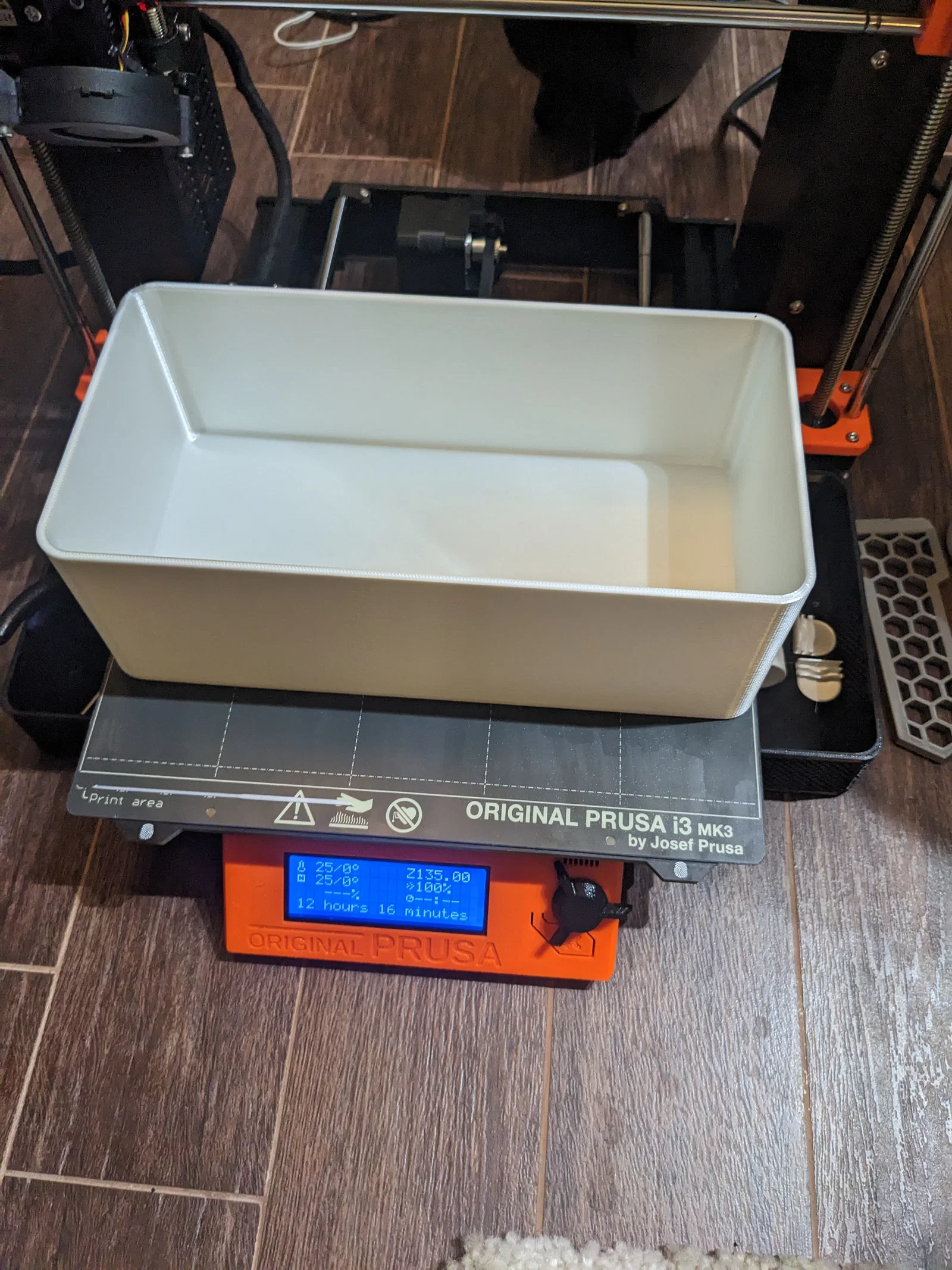 Mình có gặp một chút vấn đề là các mảnh lớn bị cong vênh nhẹ ở các góc. Không có cái nào bị hỏng đến mức phải in lại và chúng vẫn dùng tốt, nhưng mình vẫn thấy hơi khó chịu. Mình đã thử vài cách để khắc phục và thấy hiệu quả nhất là hạ nhiệt độ bàn in xuống sau lớp đầu tiên. Dù vậy, vẫn có hai góc bị cong lên một chút.
