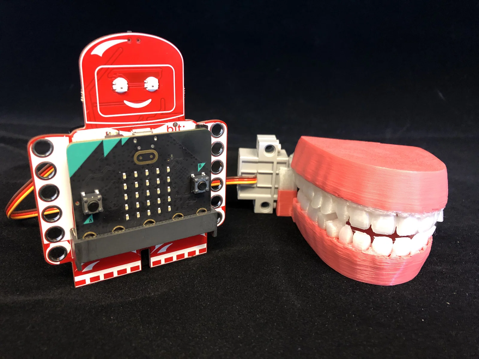 Đây là bản cải tiến của mô hình hàm răng cầm tay, được thiết kế để điều khiển bằng servo geekservo. Mô hình tận dụng cảm biến âm thanh của micro:bit để tạo ra hiệu ứng cử động miệng theo âm thanh cực kỳ thú vị.