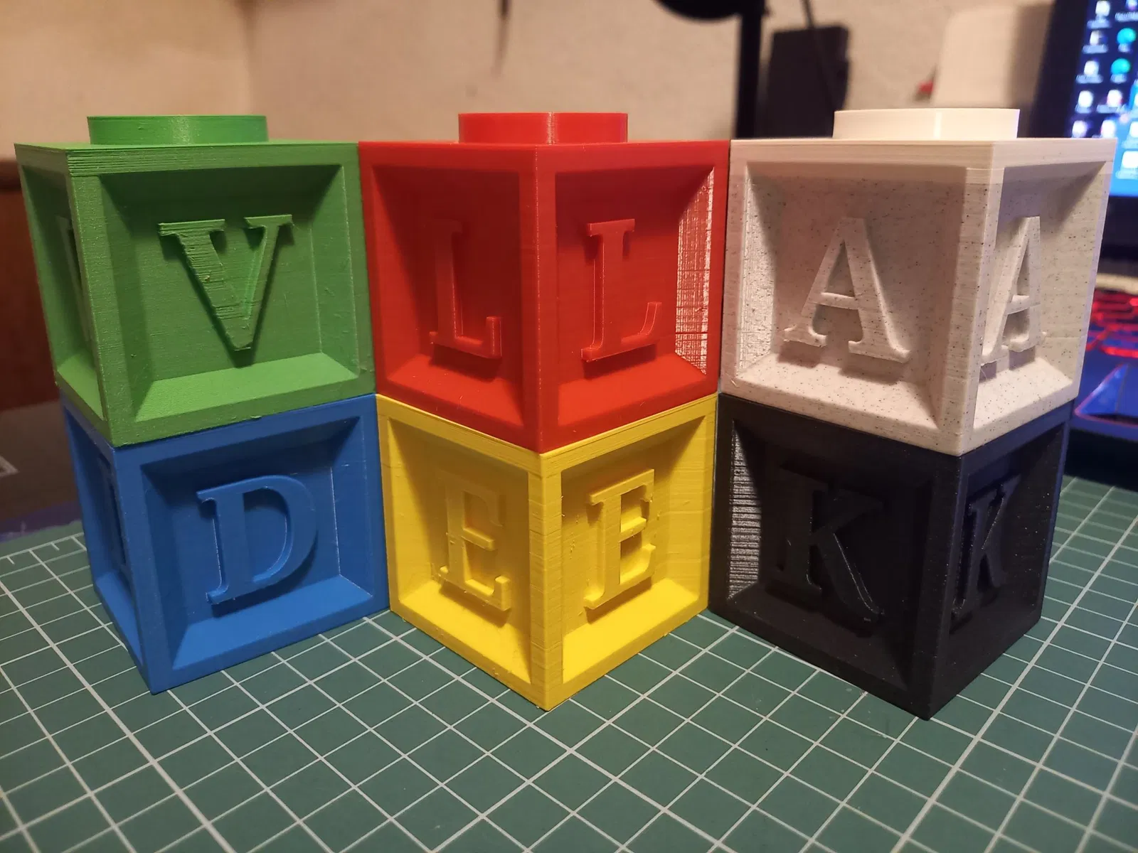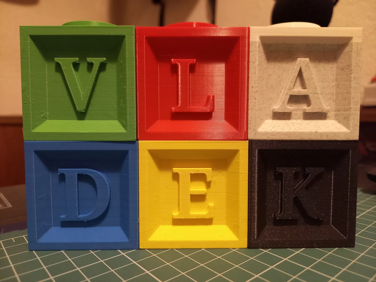 Các khối có kích thước 50 mm x 50 mm x 50 mm. Chốt ở trên cùng thêm 5 mm vào chiều cao của khối, tổng cộng là 55 mm theo trục Z.
