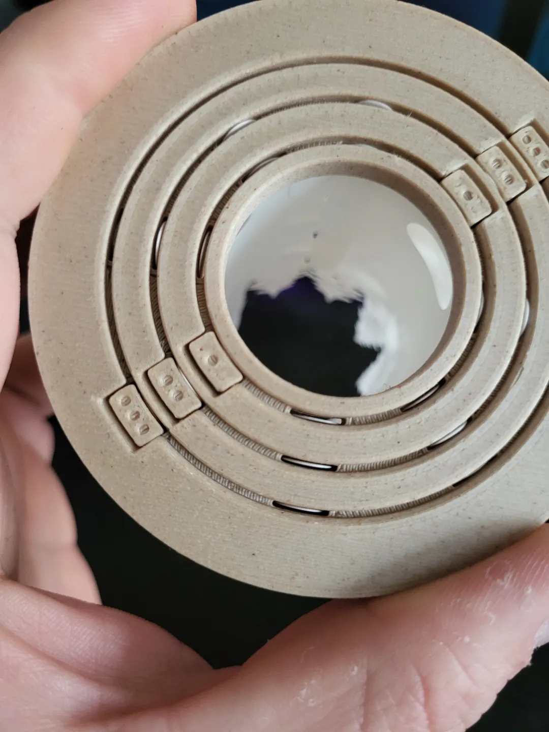 Vì lồng đèn in ra vẫn hơi cứng đối với các chi tiết mảnh như cành cây, bạn có thể ngâm các lớp vào nước ấm (không phải nước nóng) khoảng 1 phút, sau đó lấy ra rồi mới lắp các mấu vào lỗ. Cách này giúp các cành cây và chi tiết nhỏ dễ dàng uốn cong theo vòng tròn hơn.
