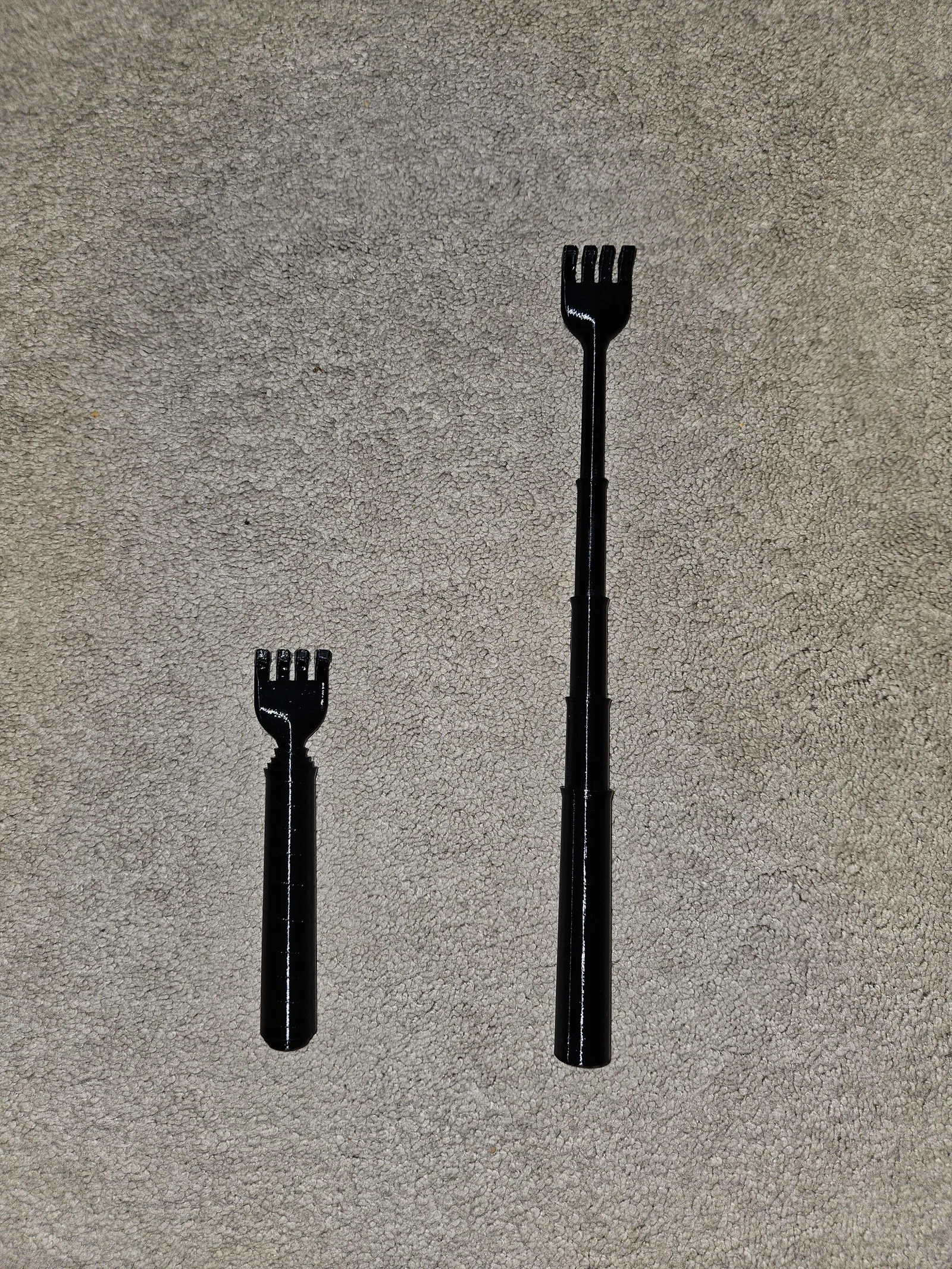 Cây gãi lưng này dài khoảng 6 inch khi thu gọn và lên tới 1 foot khi kéo dài ra. Các lớp in có thể bị dính tại vị trí z-seam, nên anh chị cần giảm thiểu hiện tượng bị chảy nhựa (stringing). Việc bật tính năng 'coasting' trong Cura sẽ giúp ích khá nhiều. Em có đính kèm thêm một miếng chặn (separator) trong trường hợp anh chị gặp khó khăn khi in.