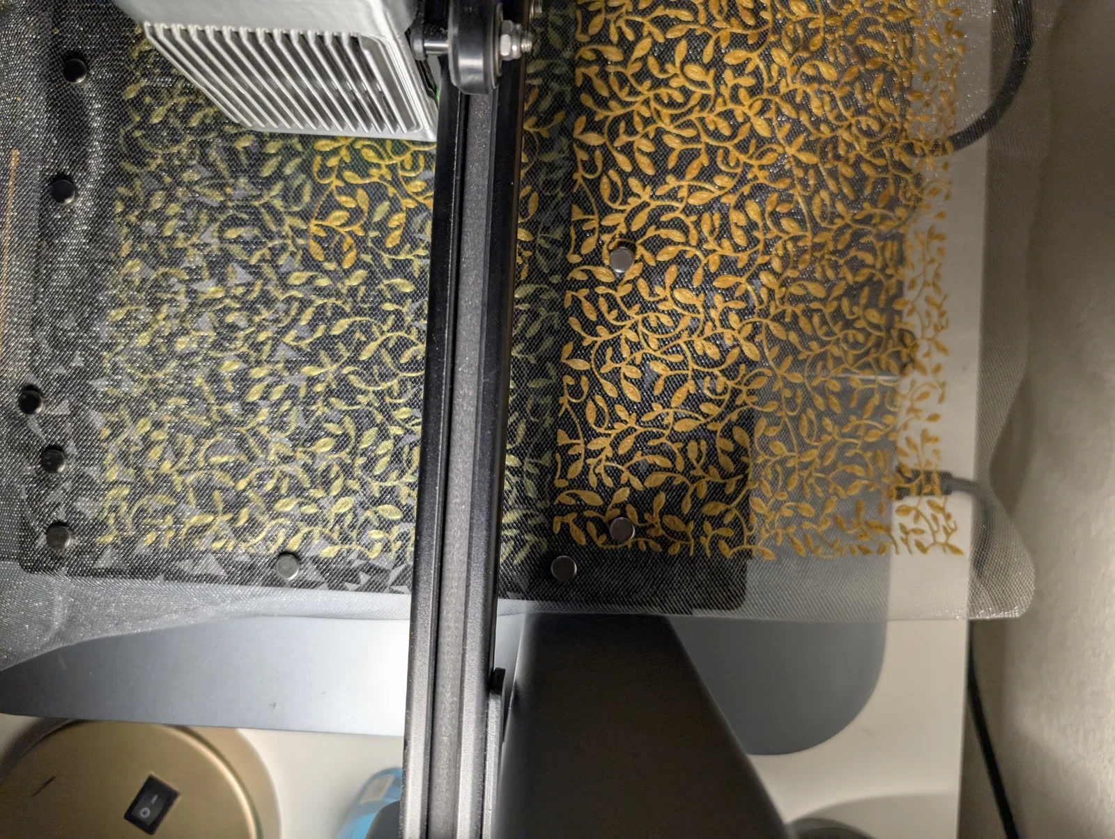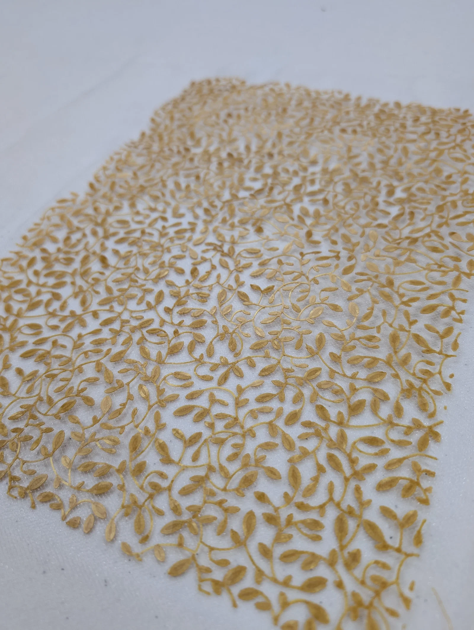 Mình muốn có một mẫu họa tiết để trang trí cho chiếc túi đang làm nên đã chuyển đổi hình ảnh thành file STL và in hai tấm, một tấm được lật ngược (mirror). Khi in trên vải, bạn hãy để chiều cao lớp in (layer height) bằng với độ dày của vải nhé, loại vải tulle mình dùng có độ dày là 0.14mm. Ngoài ra, dùng tấm nền in (build plate) loại holographic sẽ giúp bề mặt phía dưới mịn đẹp hơn, còn mặt trên thì có thể hơi nhám một chút. Không có bí quyết gì đặc biệt khi khâu vải tulle cả, chỉ cần cẩn thận vì loại vải này rất mỏng manh. Mô hình này có độ dày chưa tới 1mm. Mỗi tấm in mất khoảng hơn 1 tiếng đồng hồ.