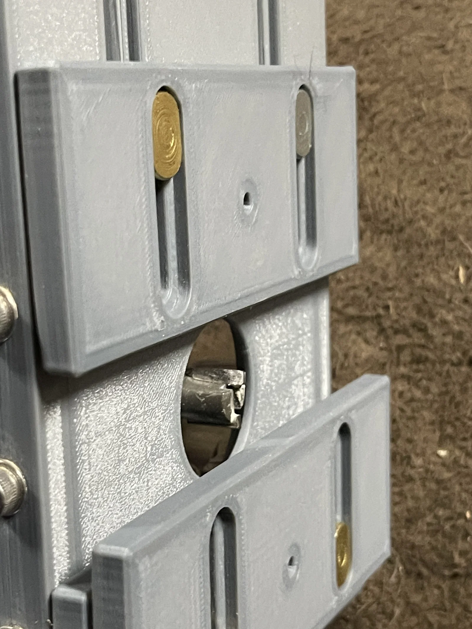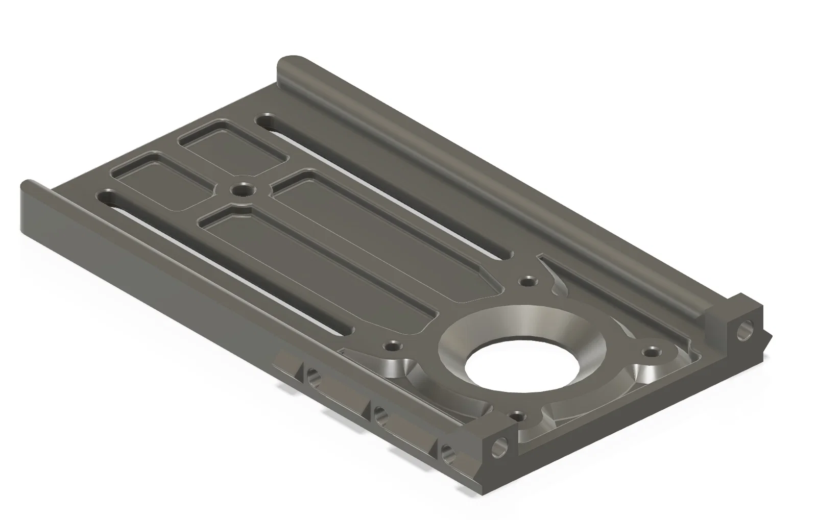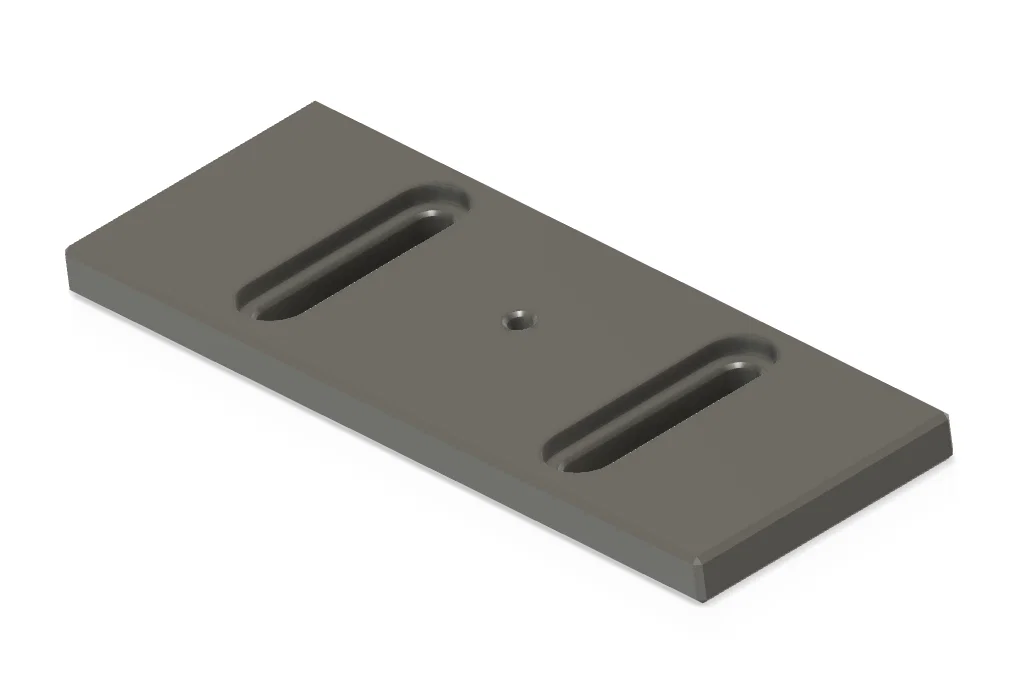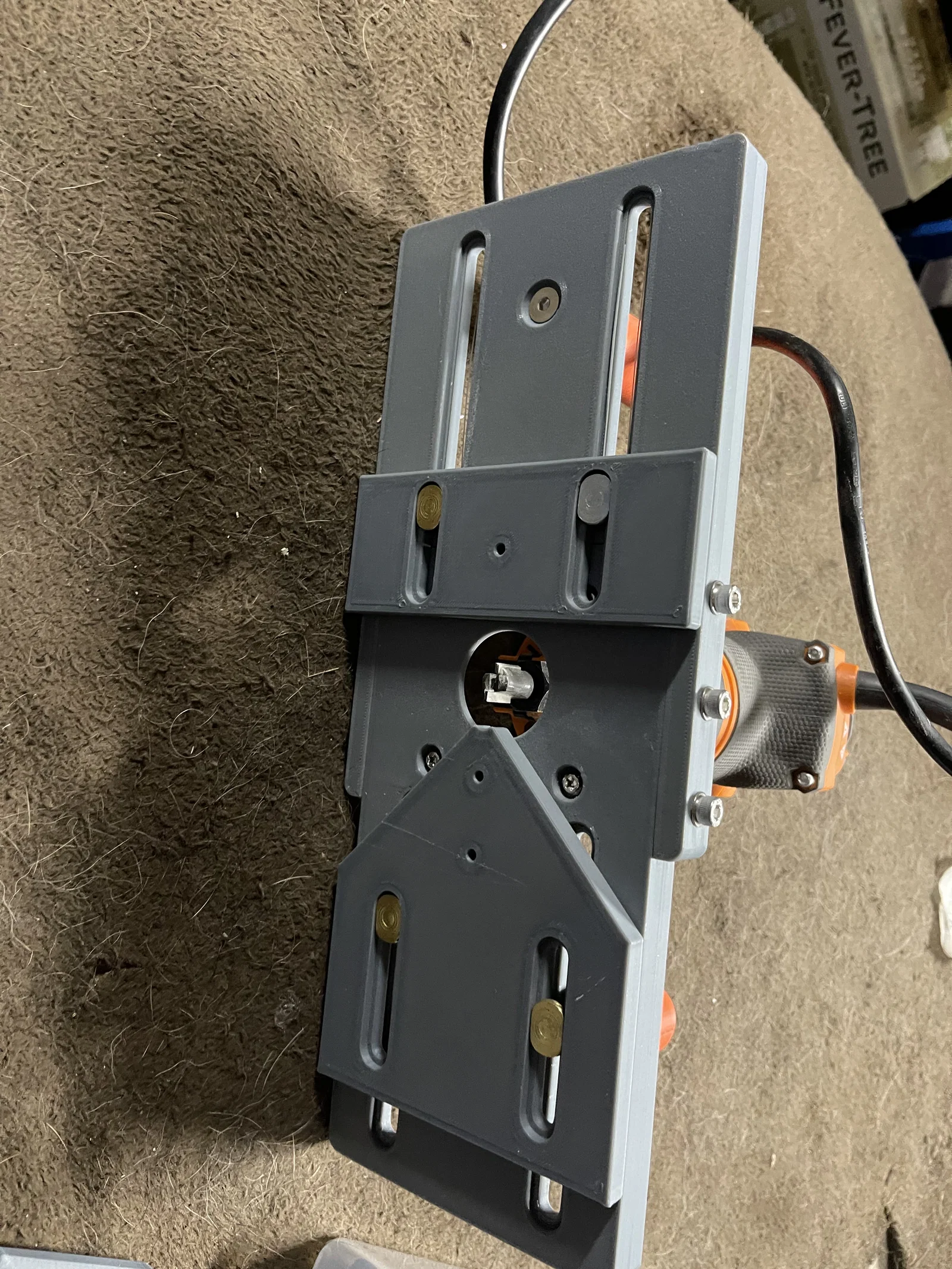 Phần đế chính của bộ gá này được in làm hai mảnh và lắp ráp bằng đai ốc nhiệt (heat inserts). Tôi dùng máy phay Ridgid và đã thiết kế để vừa khít với nó. Các bác có thể tùy chỉnh lại thiết kế cho máy của mình vì tôi có đính kèm cả file STEP và file F3D (Fusion 360).