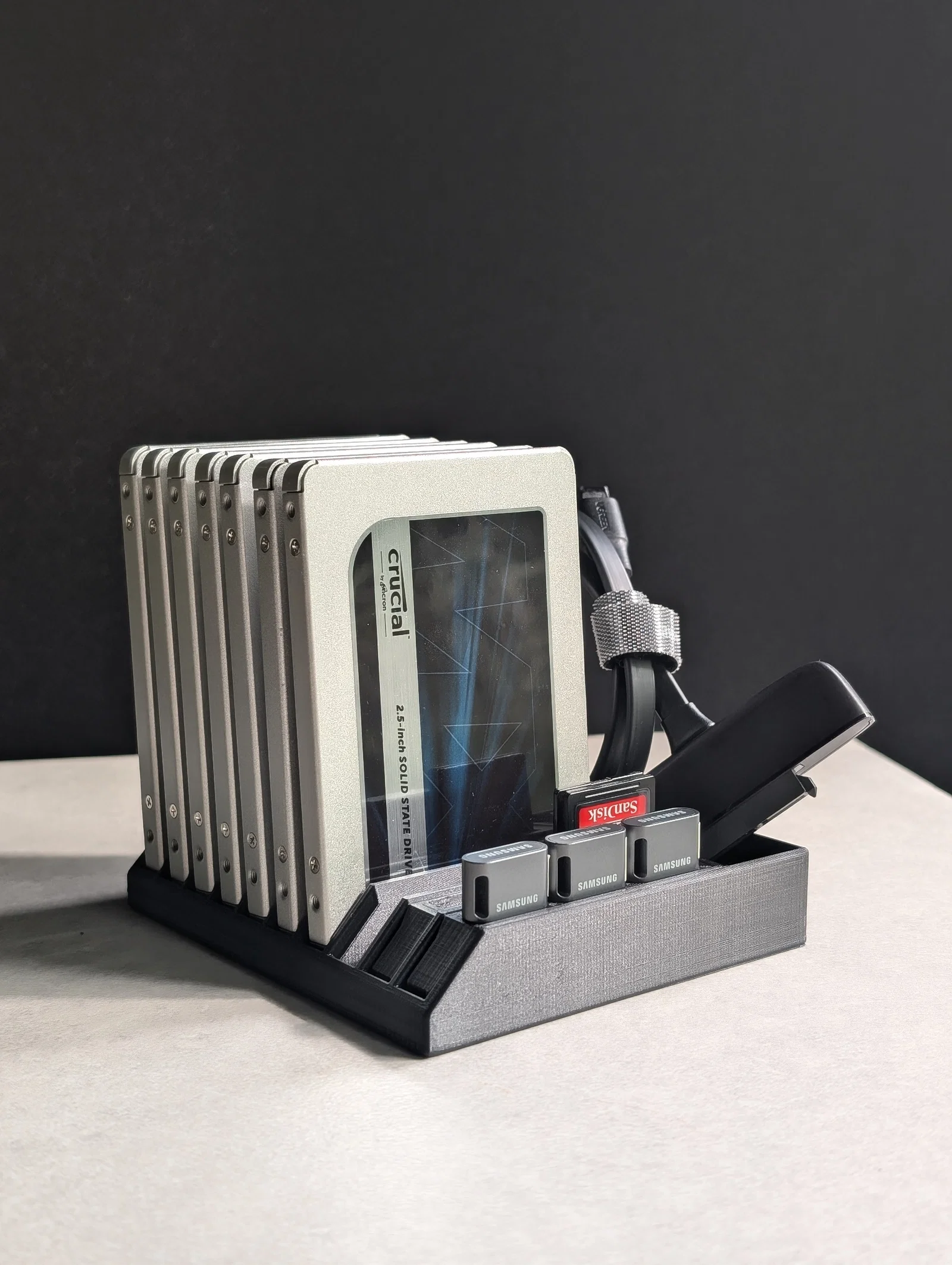 Đây là mẫu khay đựng 10 ổ cứng 2.5" SATA để bàn, có thêm không gian bên cạnh để cất dây cáp SATA sang USB, cùng các khay lắp ghép tùy chọn cho ổ USB loại A và thẻ nhớ SD.