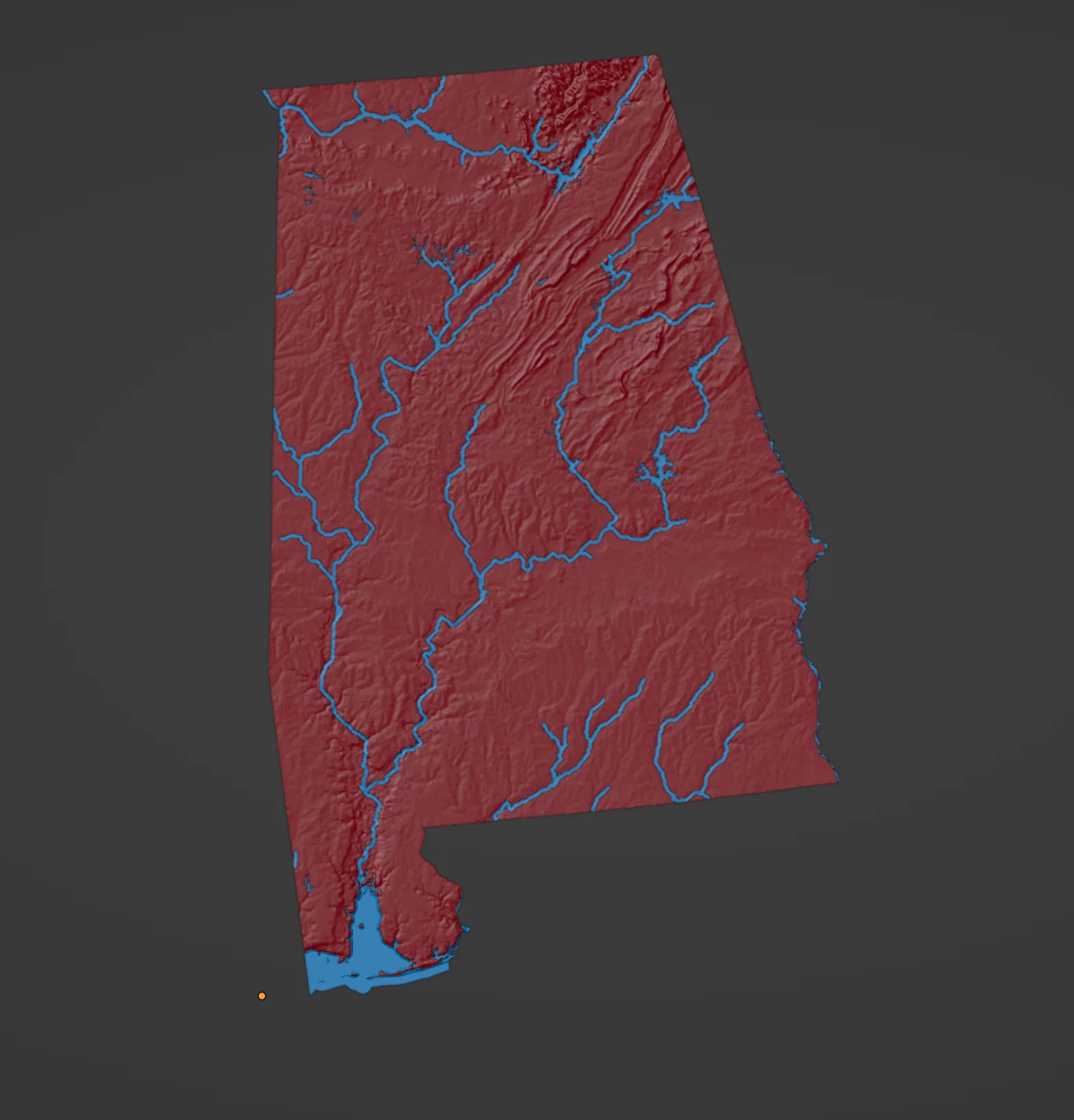 Mô hình bản đồ địa hình chi tiết của tiểu bang Alabama, Mỹ, bao gồm núi non, sông, hồ và đường bờ biển. Thiết kế 3MF tối ưu cho in 2 màu hoặc 1 màu, có thể ghép lại với các tiểu bang khác trong cùng dự án USAofPlastic.