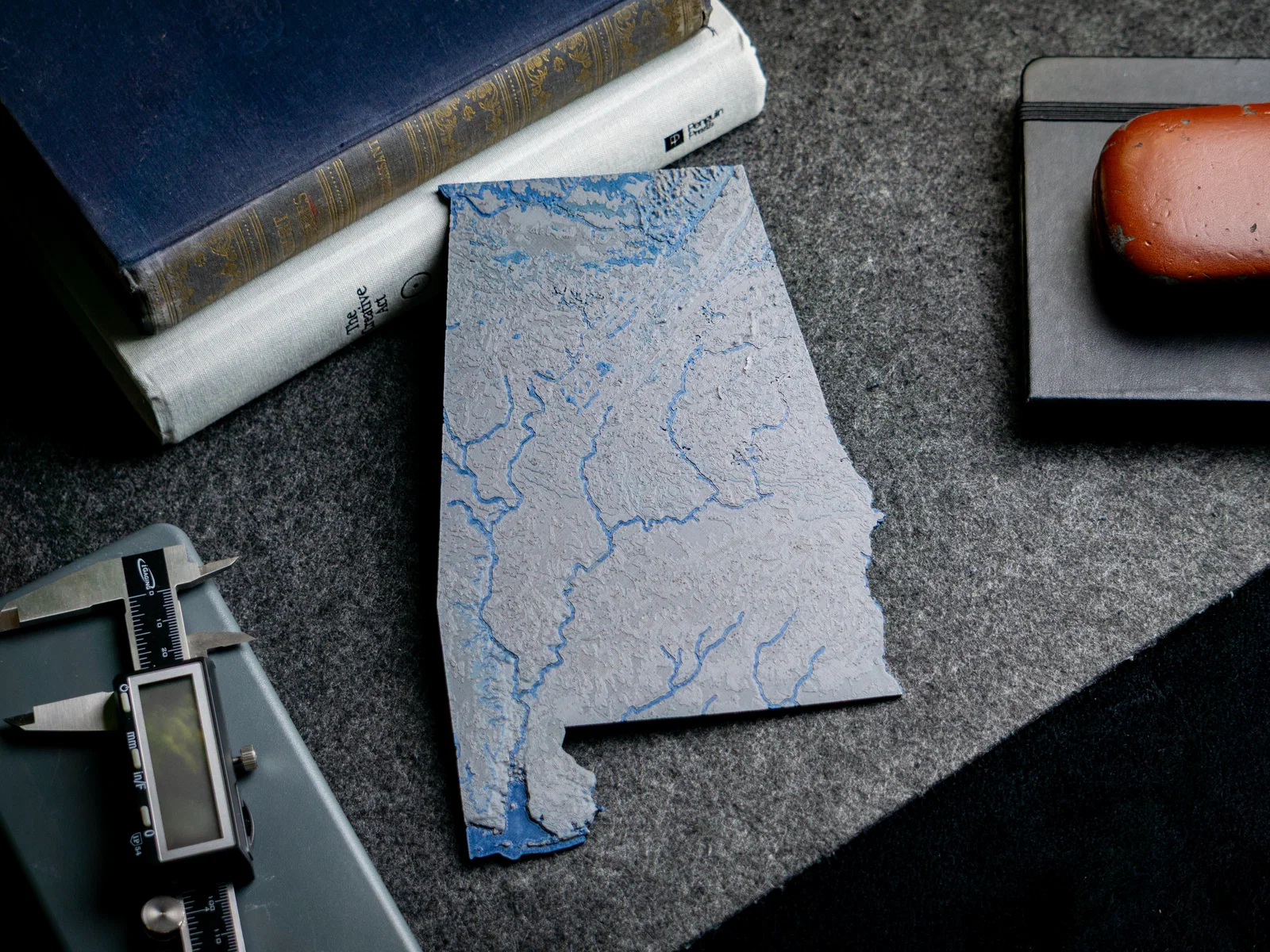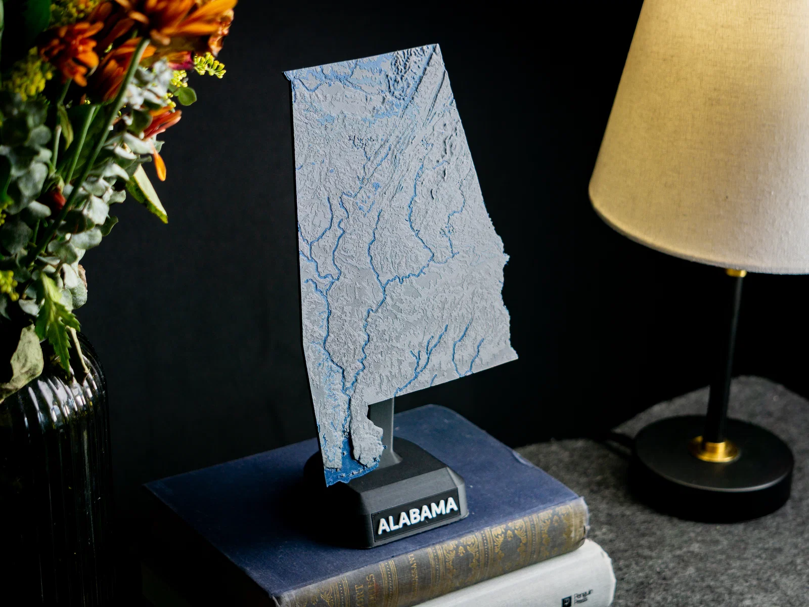 Đây là mô hình bản đồ địa hình và thủy văn của tiểu bang Alabama, Mỹ, bao gồm núi non, đường bờ biển, sông ngòi và hồ nước, hỗ trợ in hai màu hoặc một màu! Tất cả các tiểu bang trong dự án USA of Plastic đều được thiết kế ở tỉ lệ 1:2500000 và có thể ghép lại với nhau như những mảnh ghép hình.