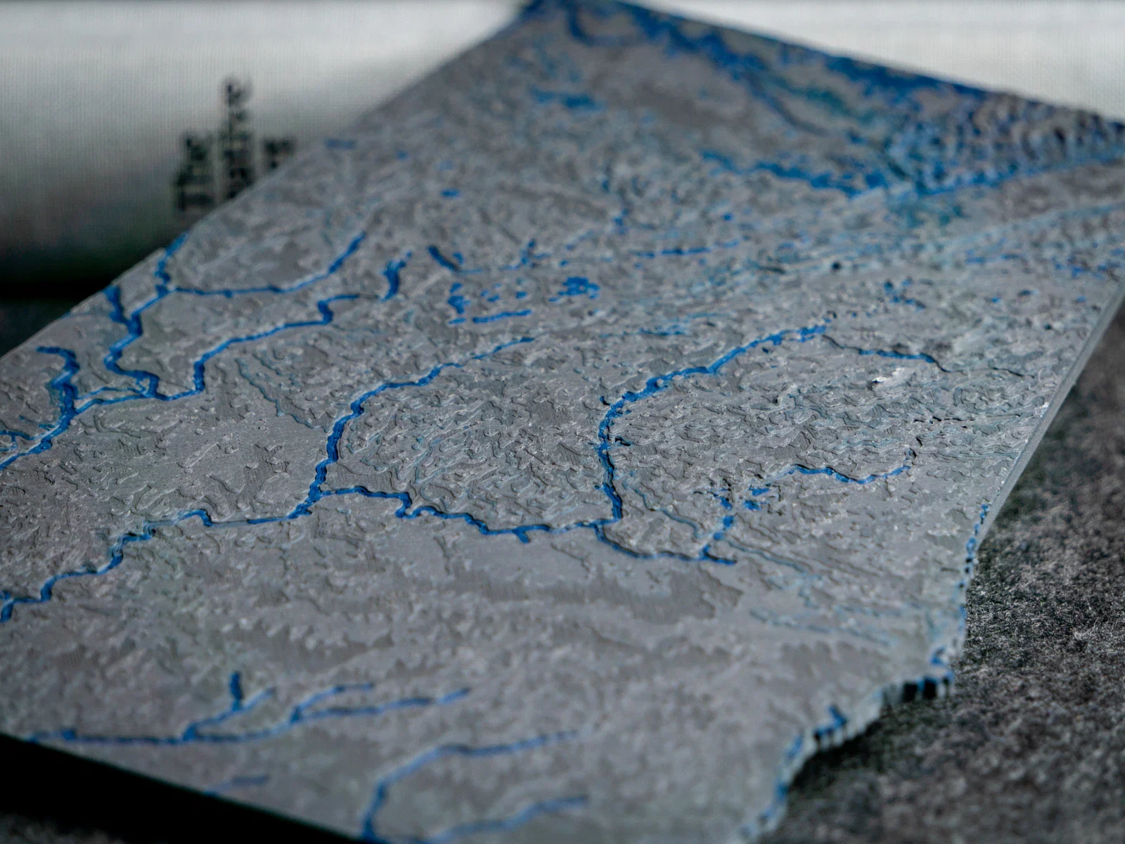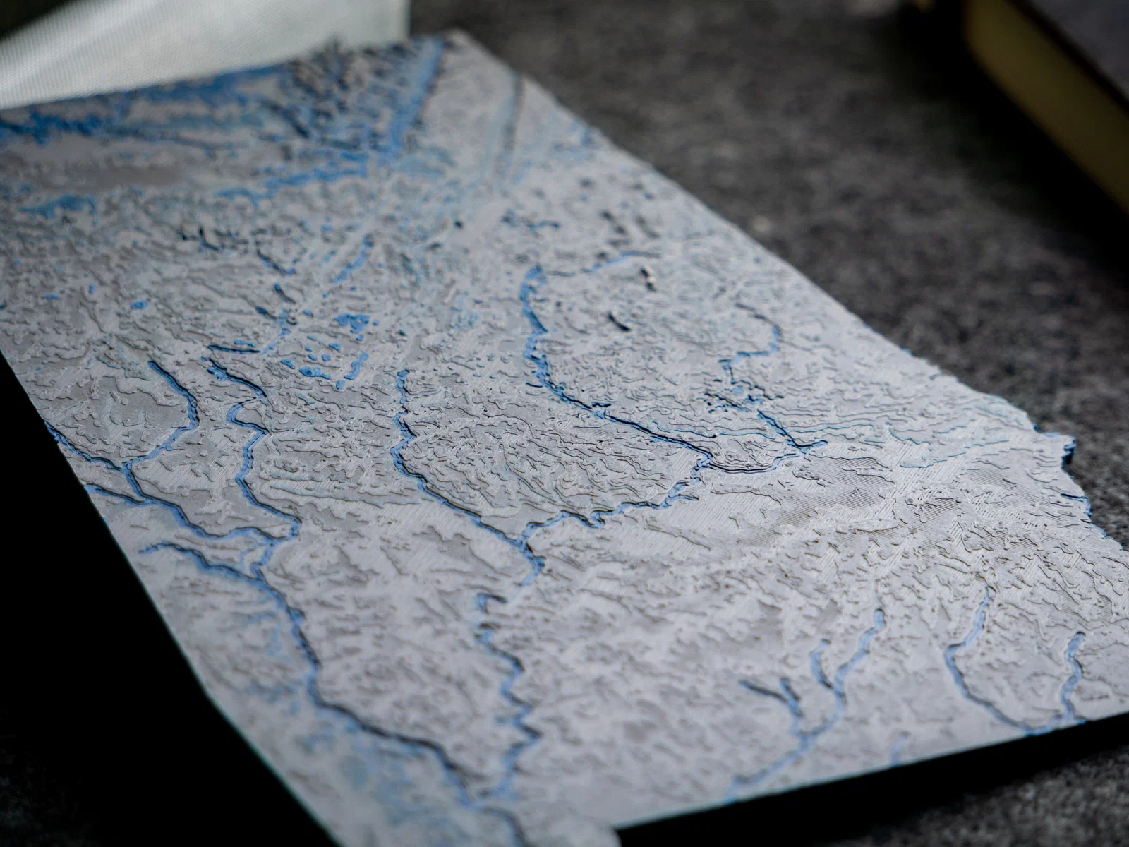 Để làm nổi bật các dòng sông, hồ và đường bờ biển, bạn có thể sử dụng nhựa in (filament) phát quang hoặc nhựa trong suốt, hoặc đơn giản là dùng màu khác với phần nền!