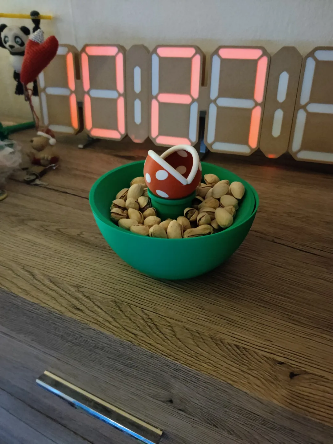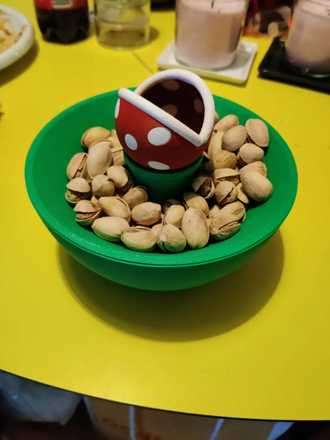 Bạn đang tìm kiếm một món đồ trang trí vừa độc đáo, vừa có công năng sử dụng thực tế cho góc gaming của mình? Chiếc tô đựng hạt dẻ cười (Pistachio Bowl) lấy cảm hứng từ nhân vật Piranha Plant trong game Mario chính là lựa chọn hoàn hảo. Với thiết kế thông minh gồm hai tầng tách biệt, chiếc tô này cho phép bạn đựng hạt ở phía trên và bỏ vỏ trực tiếp vào miệng của cây Piranha ở trung tâm. Vỏ hạt sẽ được thu gom gọn gàng vào phần tô bên dưới, giúp bàn làm việc hay bàn trà của bạn luôn sạch sẽ. Đây là phụ kiện in 3D tuyệt vời, kết hợp giữa niềm đam mê gaming và sự tiện dụng trong đời sống hằng ngày. Sản phẩm dễ dàng in ấn bằng nhựa PLA, phù hợp cho mọi không gian sống từ phòng khách đến bàn làm việc.