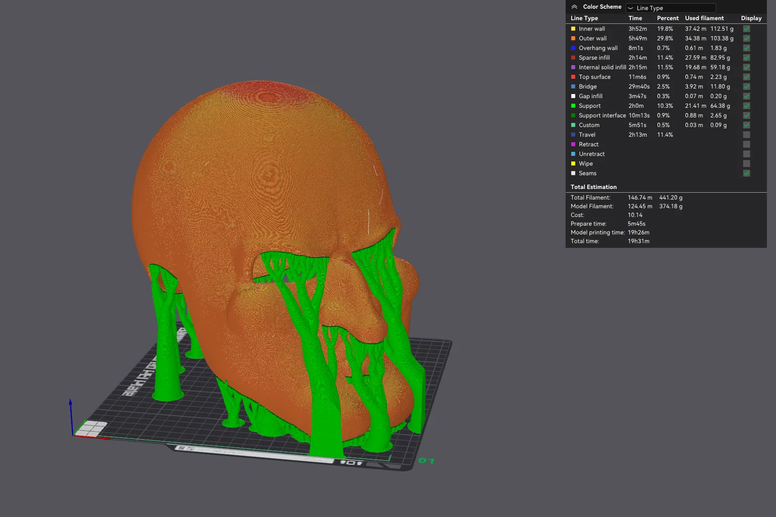 Tui in với layer height 0.20mm, infill 7% kiểu Gyroid và có bật tree supports. Tuy nhiên, tui có đặt thêm support blocker ở phần nóc bên trong mũ—nó in vẫn mượt mà không cần support ở đó đâu.