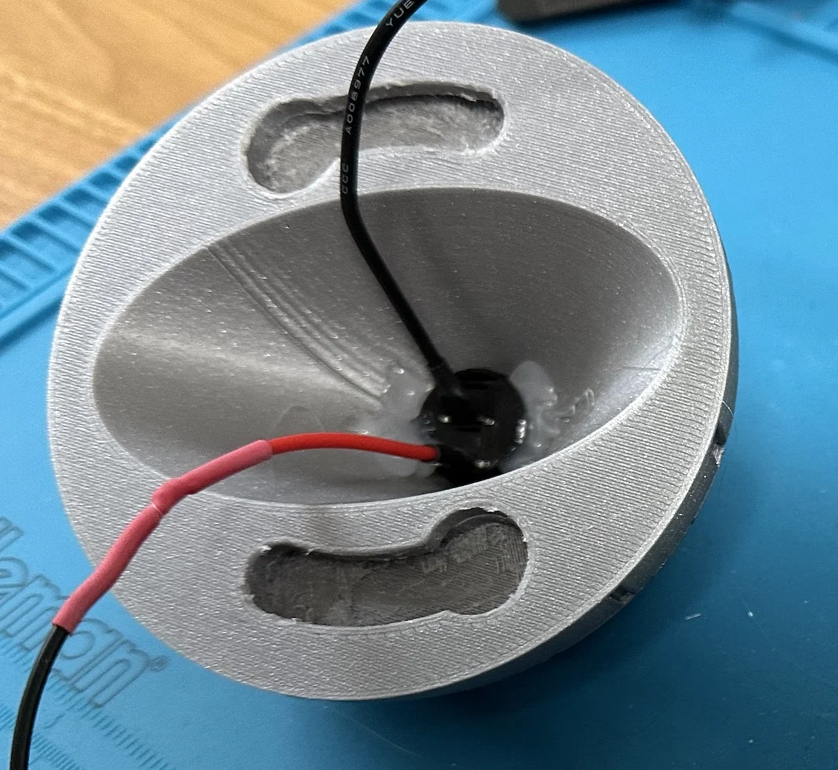 Mình muốn sử dụng pin sạc AAA nên cần thêm không gian bên trong món đồ trang trí này. Mình đã dùng và thêm một đèn LED thứ hai vào bên trong để chiếu sáng phần rãnh (trench), phần này mình in bằng nhựa PETG trong suốt. Tuy nhiên, nó không hoạt động hiệu quả với mô hình của mình do cụm pin quá lớn.