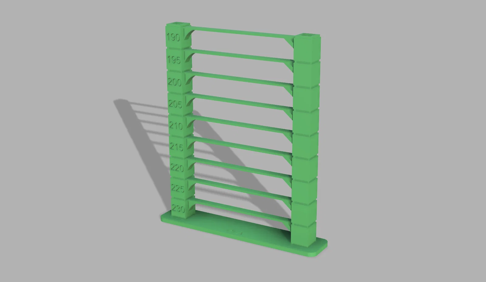 Tui muốn tìm một cái tháp nhiệt độ in thật nhanh vì mấy mẫu khác thường mất tới vài tiếng đồng hồ. Tui tìm được mẫu này của spiga76, tui đã chỉnh lại một chút ở phần PLA để chạy từ 230-190 thay vì 240-200 và thêm nhãn cho các loại nhựa in.