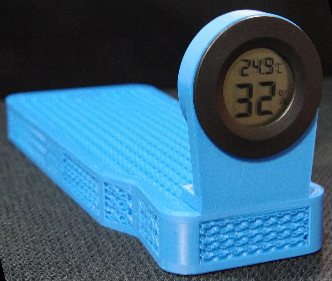 Hộp đựng hạt hút ẩm tích hợp giá đỡ nhiệt ẩm kế cho thùng đựng ngũ cốc 4L. Thiết kế tối ưu với modifier để in nhanh bằng dạng infill gyroid, hỗ trợ nhiều loại thùng nhựa phổ biến.