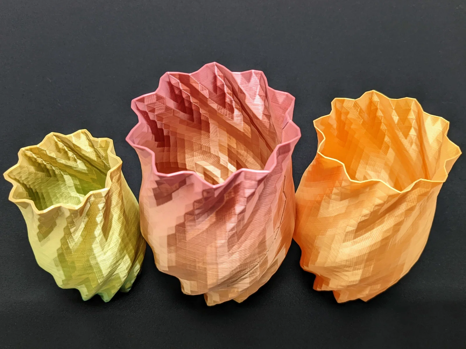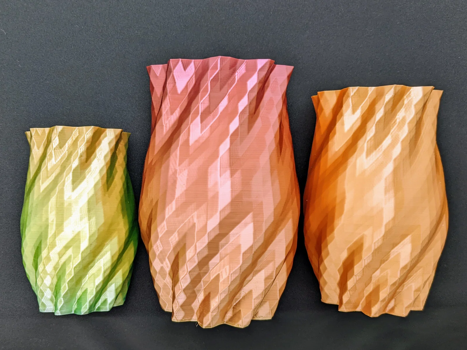 - Lựa chọn vật liệu: Các loại nhựa PLA có hiệu ứng chuyển màu (gradient) hoặc bóng (silk) sẽ làm nổi bật các góc cạnh tam giác, khiến chiếc bình trở nên lấp lánh hơn dưới ánh đèn.