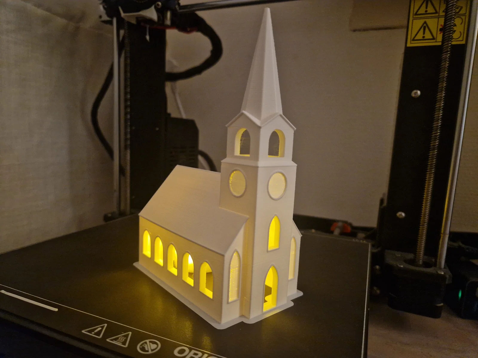 Nên in với 1 đường biên (perimeter) và 0% infill để ánh sáng từ đèn LED xuyên qua tốt nhất. Đối với phần tòa nhà, bạn hãy cân nhắc in thêm lớp lót (brim) ở cả mặt trong và mặt ngoài để giúp bám dính vào bàn in tốt hơn. Không cần sử dụng supports.
