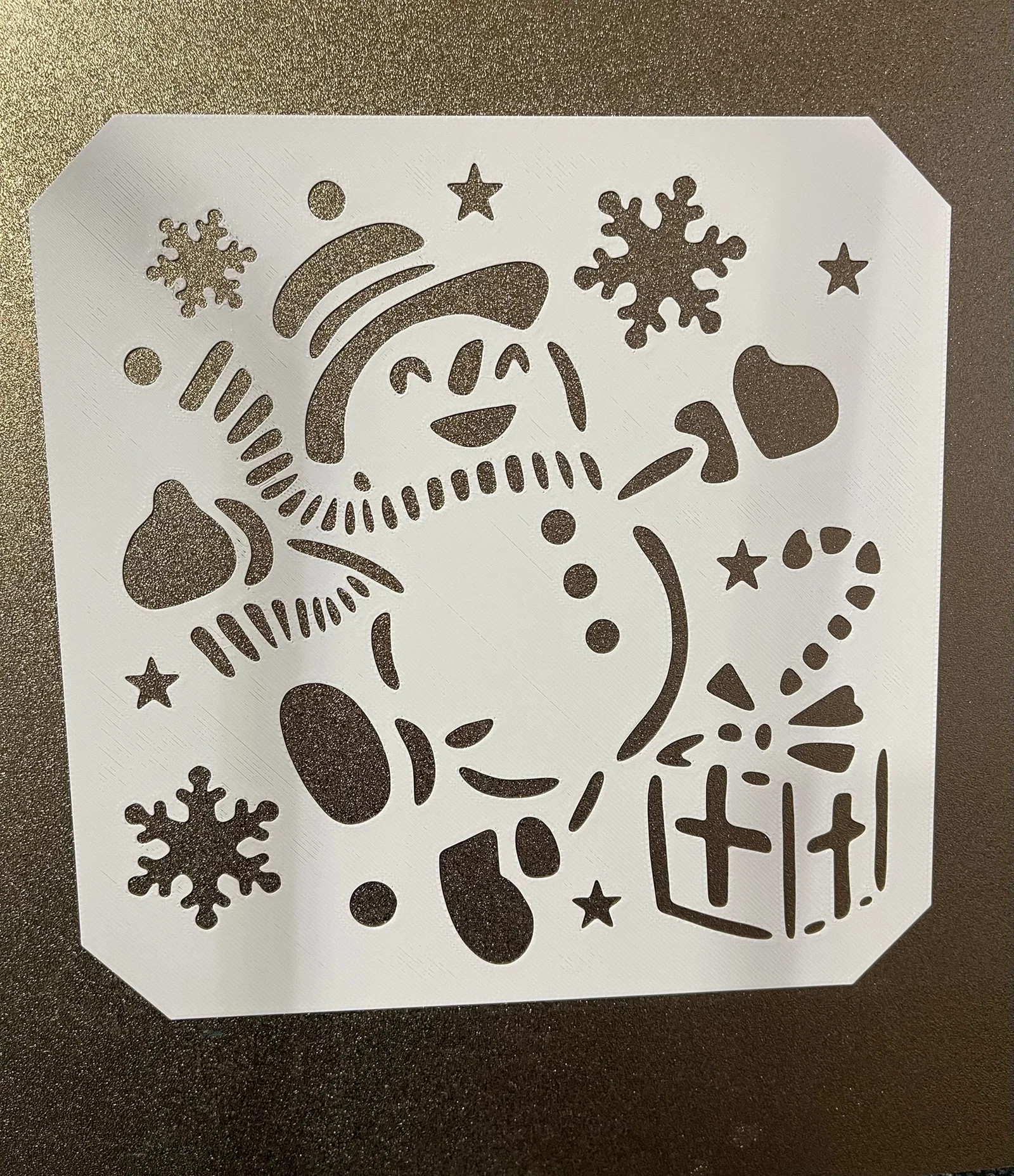 Mẫu stencil người tuyết cầm quà đơn giản cho dịp Giáng sinh. Phù hợp để vẽ trang trí trên cửa sổ, tường nhà hoặc dùng trong scrapbook và làm đồ thủ công. Kích thước 170x170x0.4 mm, hỗ trợ tốt cho các dòng máy in 3D phổ biến.