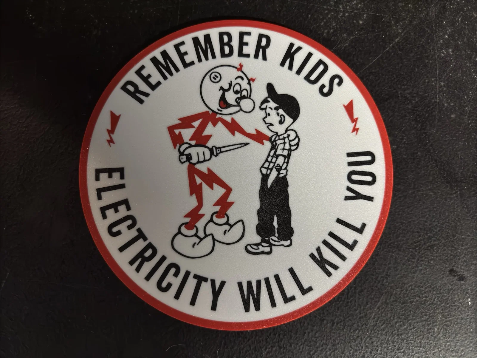 Sản phẩm này đặc biệt phù hợp cho những ai sở hữu máy in 3D hỗ trợ đa màu như AMS (Automatic Material System) hoặc MMU (Multi Material Unit). Nhờ cấu trúc in phẳng, các lớp màu được thể hiện rõ ràng, tạo độ tương phản cao giữa phần nền và các chi tiết cảnh báo, giúp thông điệp "Remember Kids, Electricity Will Kill You" trở nên nổi bật và dễ đọc hơn bao giờ hết. Bạn có thể treo bảng này tại các khu vực dễ gây nguy hiểm để nhắc nhở mọi người luôn cẩn thận.