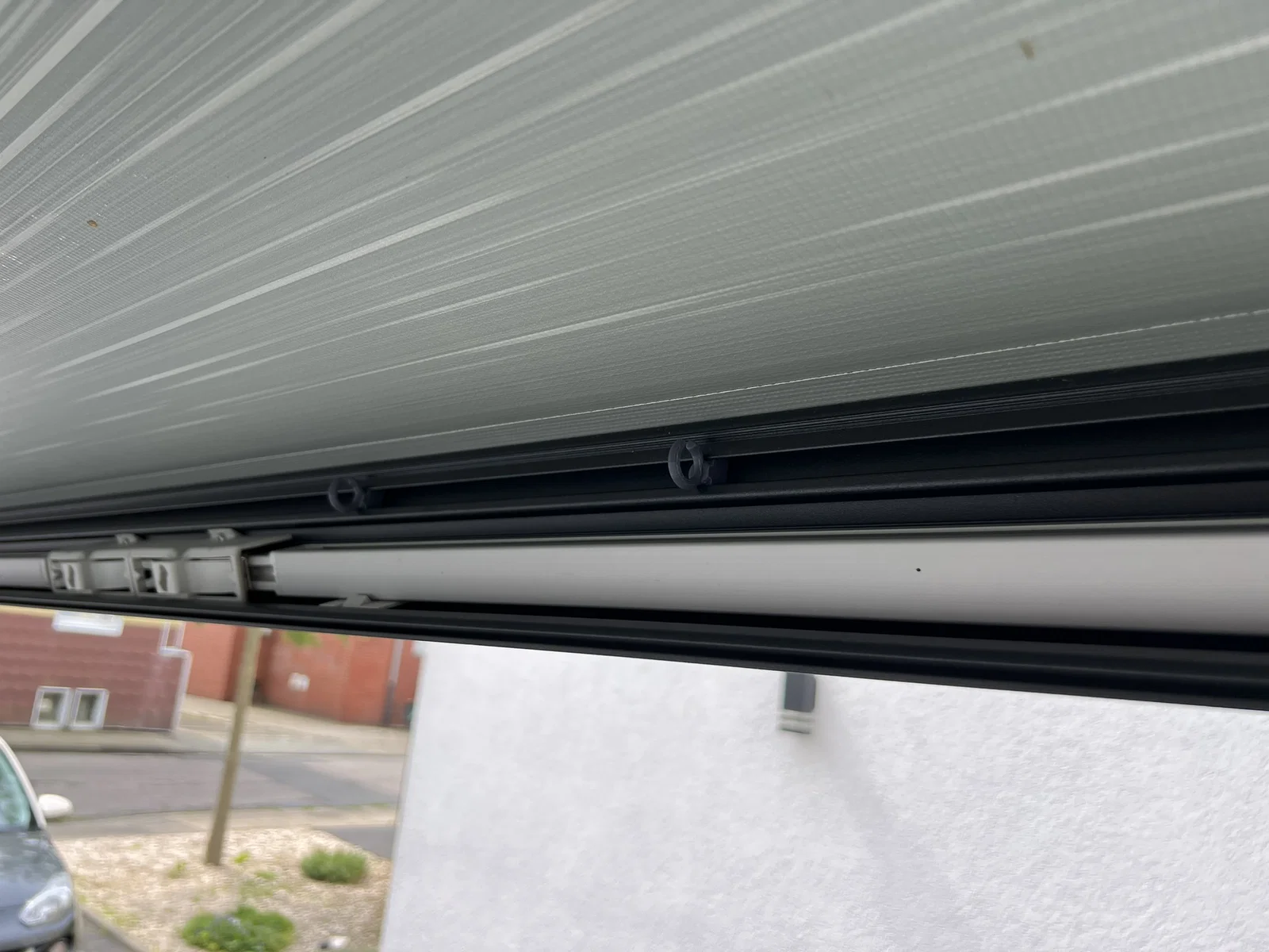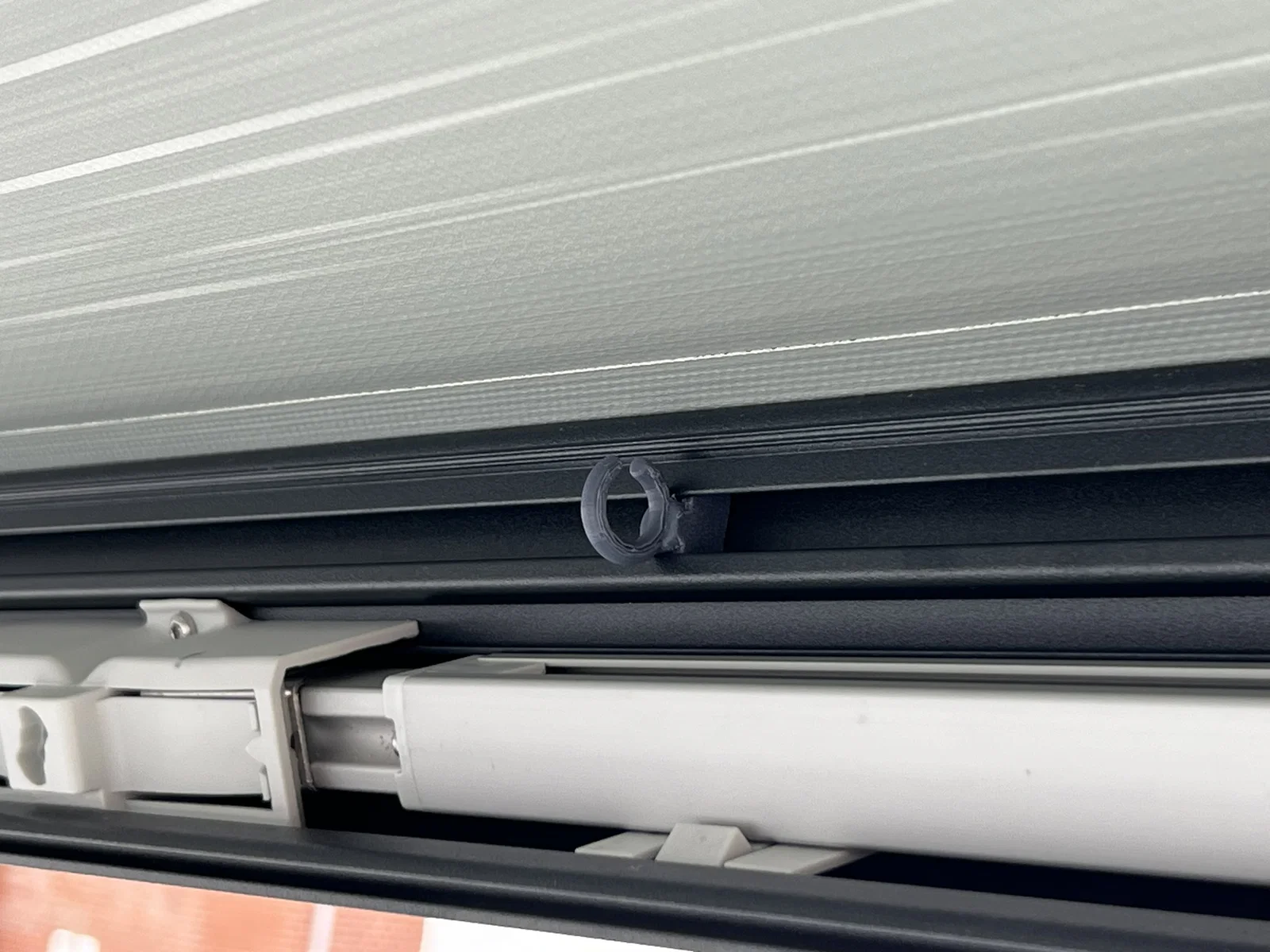 Vì tụi mình hay luồn tấm che nắng vào khe Keder của mái hiên, nên mình cần vài cái móc để treo dây đèn trang trí. Bên cạnh khe Keder, phần khung mái hiên còn có thêm một rãnh khác nữa. Mấy cái móc này được thiết kế theo dạng Nutstein (con chạy rãnh trượt), chỉ cần xoay nhẹ là gắn vào được ngay. Lưu ý là thiết kế khung của dòng 5200 và 4200 có sự khác biệt nha mọi người.
