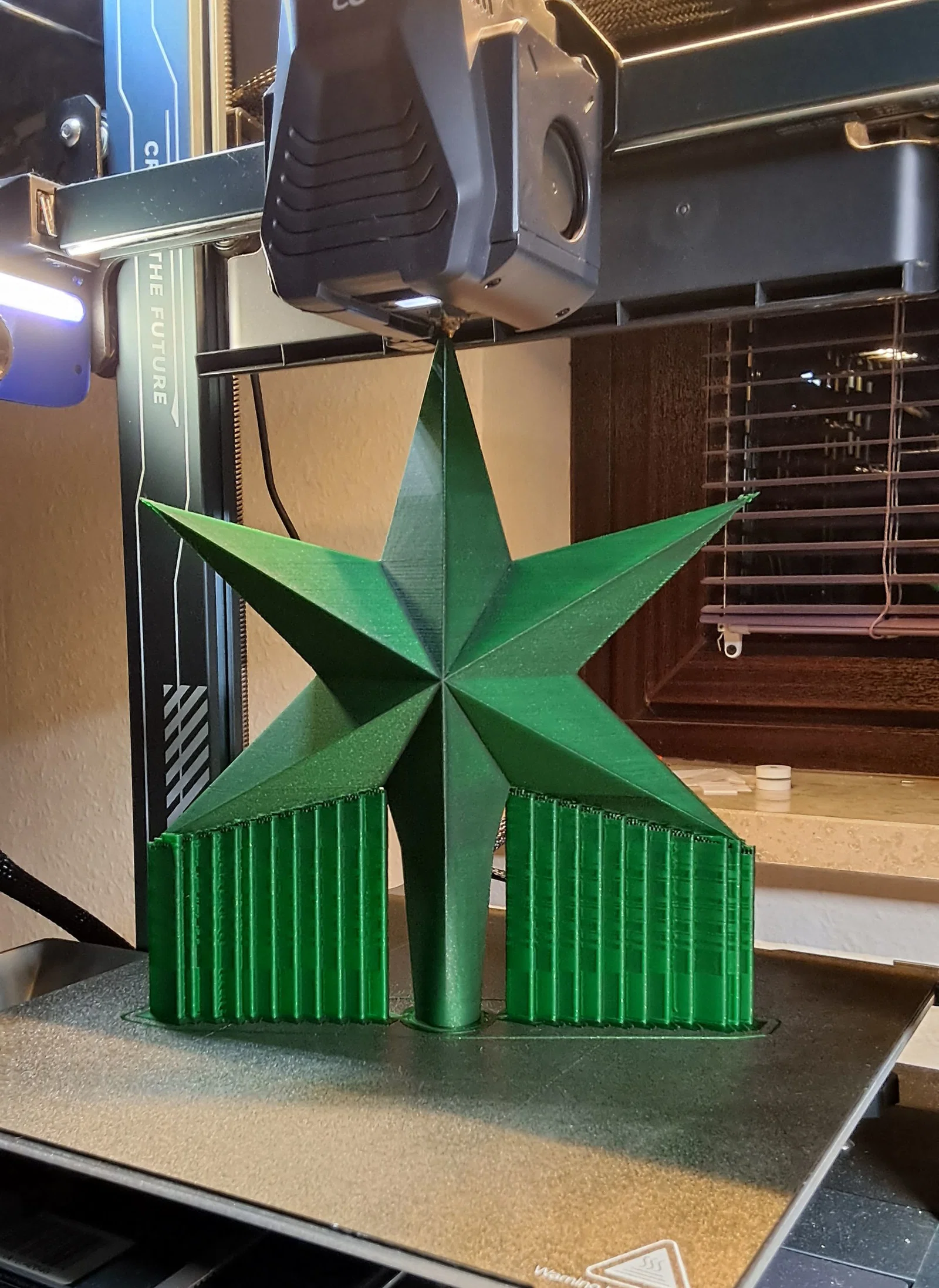 Đây là phiên bản "anh lớn" của ngôi sao từ bộ sưu tập "Snowflake Christmas Tree" của mình, rất phù hợp để làm điểm nhấn trên cây thông Noel thật. Ngôi sao kèm ống cắm có chiều cao 20 cm, nặng khoảng 50g (cộng thêm 12g cho phần support) và chỉ mất khoảng 2 tiếng 15 phút để in trên máy "Neptune 4 pro" của mình. Bạn có thể thoải mái phóng to ngôi sao tùy ý miễn là máy in của bạn chịu được. Với thiết lập 15% Lightning Infill, máy chỉ in infill ở phần đáy xung quanh ống cắm, còn thân ngôi sao thì không cần infill (ít nhất là khi dùng Orca Slicer). Độ cứng cáp với 3 đường tường (wall lines) là quá đủ rồi. Nếu bạn muốn chắc chắn hơn nữa thì cứ chọn kiểu infill khác nhé. Thực tình lúc đầu mình định in bằng Geetech Silk-PLA, nhưng các đầu nhọn bên dưới không dính vào support, khiến phần đã in bị bở ra khi gỡ khỏi bàn in. Dòng Silk trông rất đẹp nhưng mình thường gặp vấn đề về độ bền. Sau đó mình chuyển sang dùng Prusa Galaxy PLA và kết quả đạt được rất ưng ý.