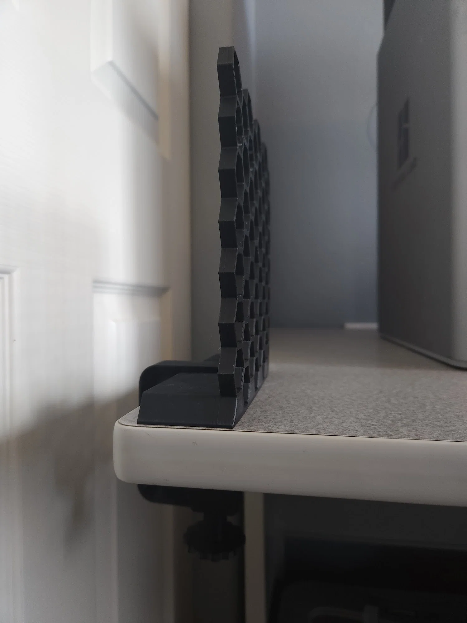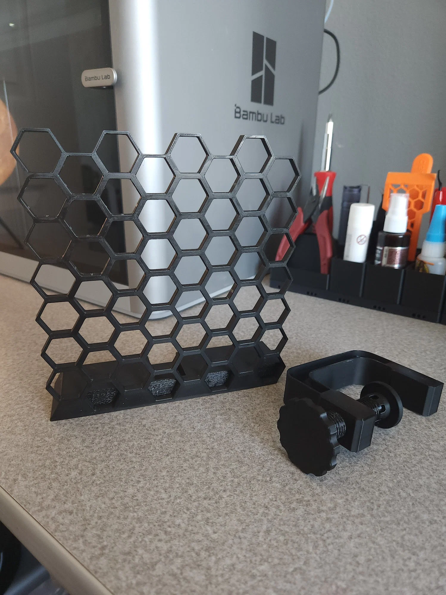 Mình muốn có một phiên bản gắn bàn của mẫu Honeycomb storage wall nên mình đã chỉnh sửa tấm panel tổ ong này bằng cách thêm phần đế để có thể kẹp chặt vào bàn bằng bộ kẹp lấy từ mẫu . Có 2 phiên bản cho bạn lựa chọn: một bản như trong hình cần in kèm support hoặc sử dụng kỹ thuật bridge, và một bản khác in được mà không cần support nhưng sẽ bị mất đi hàng lỗ lục giác ở dưới cùng.